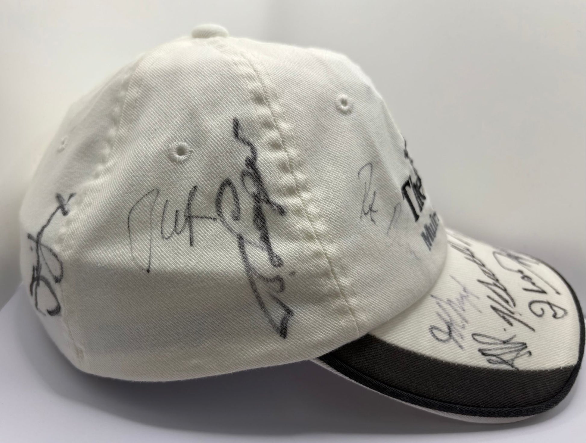 This 2002 Open at Muirfield Golf Cap is signed by 10 top players including Ian Woosnam, Bernhard Langer, Davis Love III, and Stewart Cink. With a dealer COA, this cap is a unique collector's item for any golf enthusiast. Add it to your collection and showcase your love for the sport.
