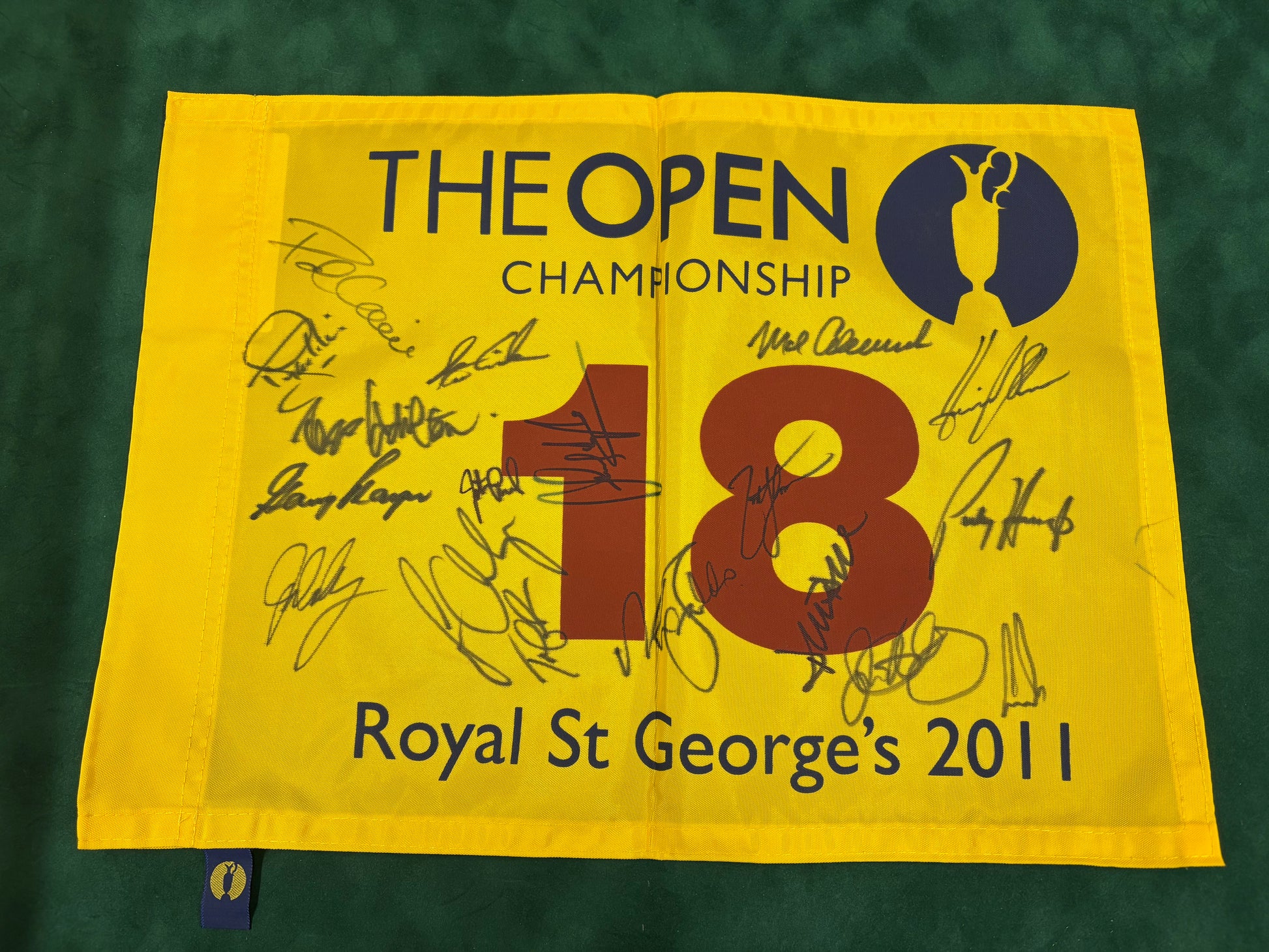On offer here is a 2011 Open at Royal St George's Golf Flag signed by 18 Winners