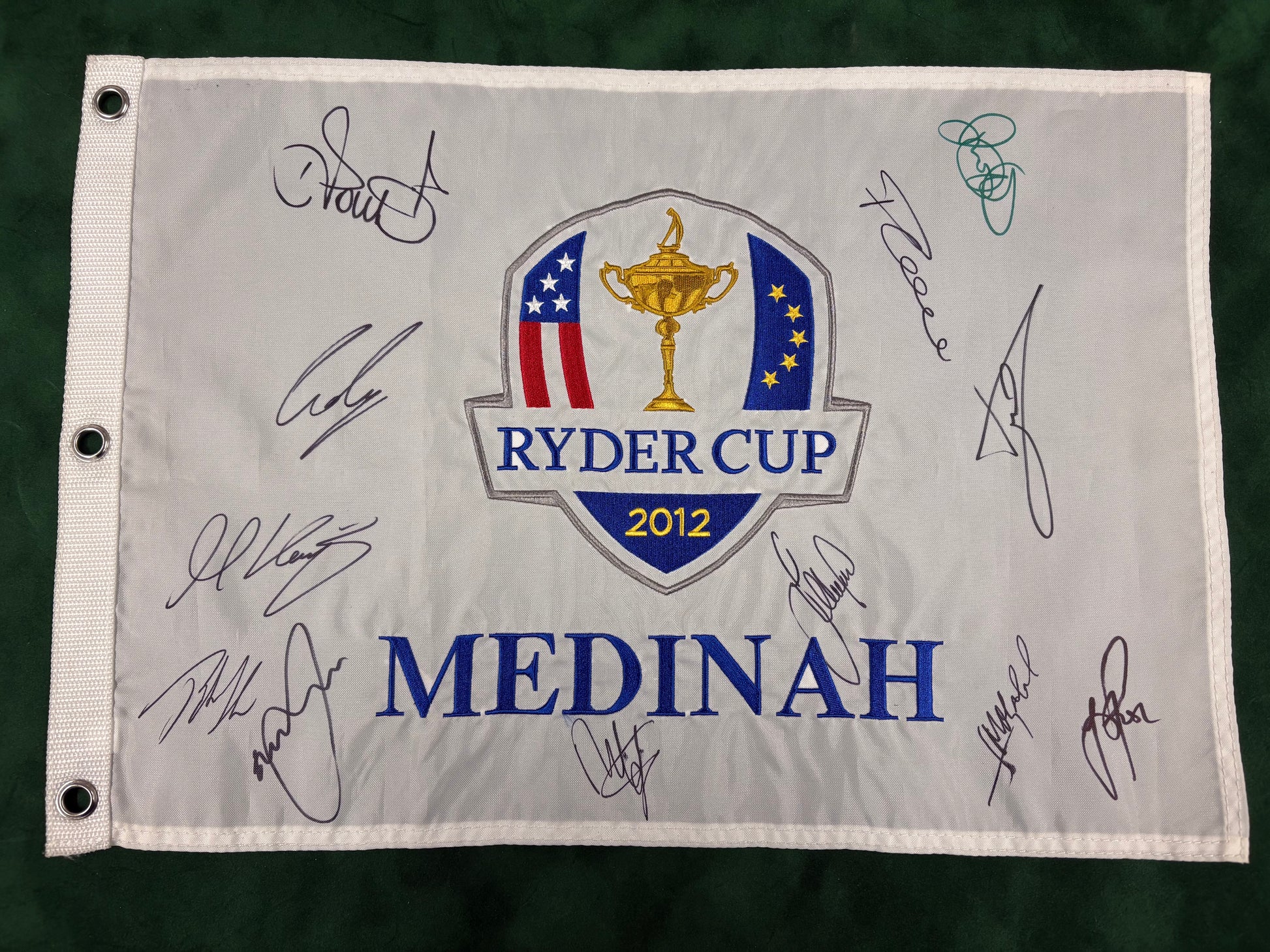 On offer here is a 2012 Ryder Cup Flag signed by 12 team members (players/captain/vices) :