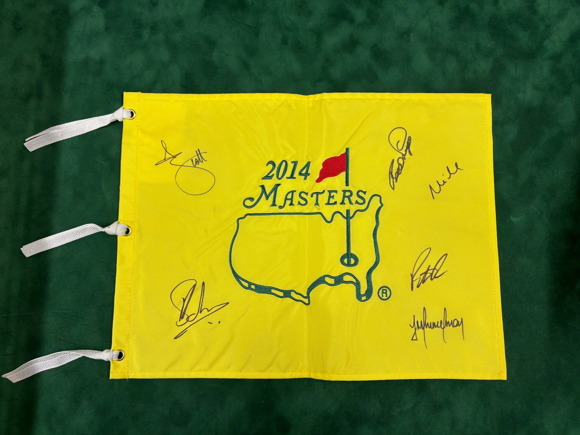 On offer here is a 2014 US Augusta Masters Golf Flag signed by : 6 Previous Winners