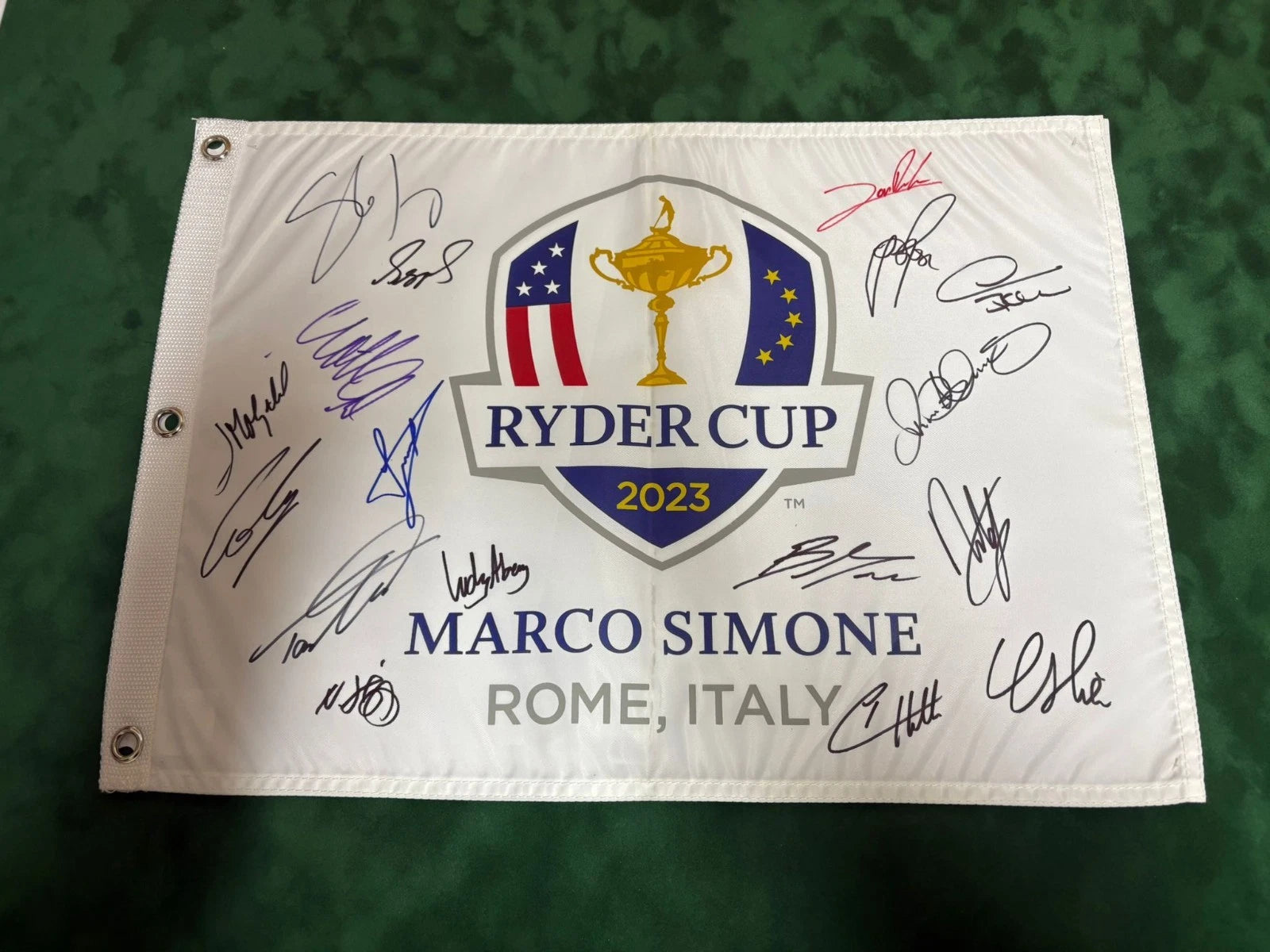 On offer here is the 2023 Ryder Cup Flag signed by 17 team members (players/captain/vices):