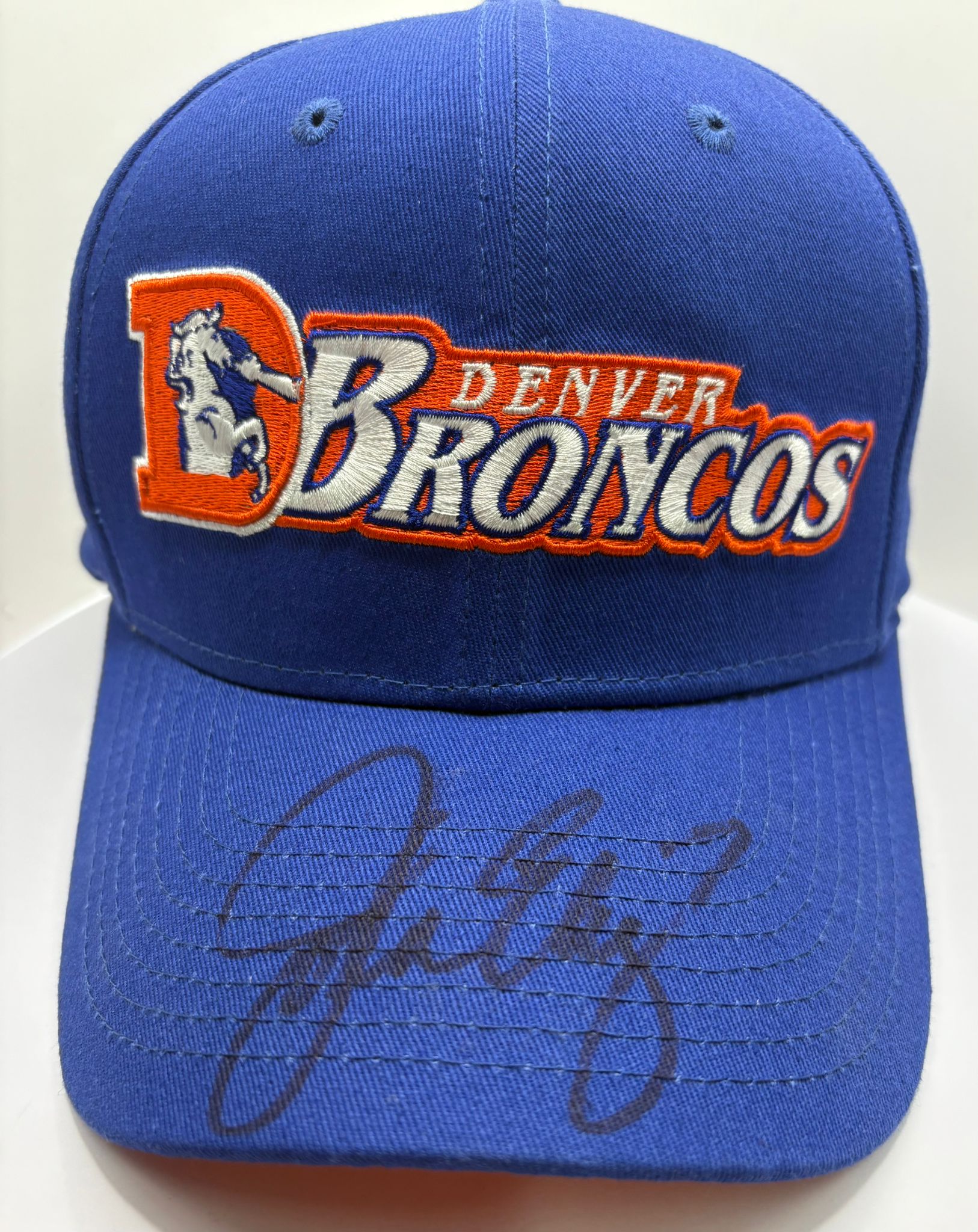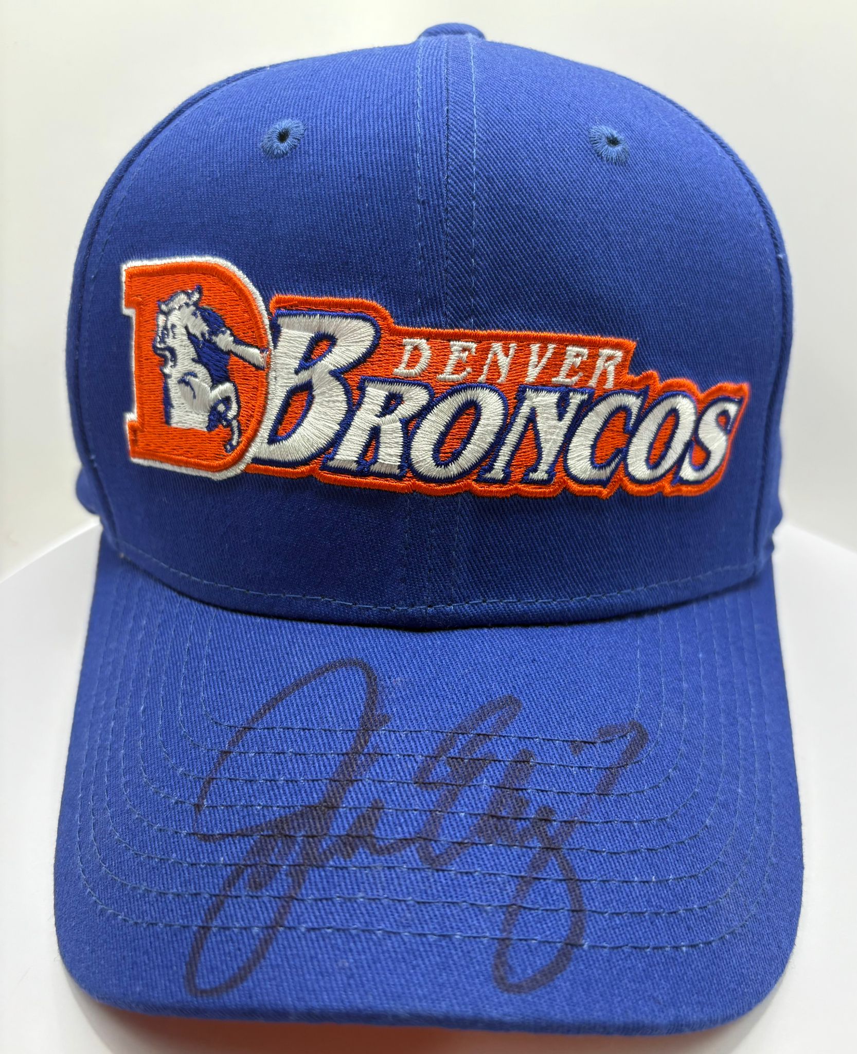 Experience ultimate fandom with this signed Denver Broncos cap by American football quarterback John Elway. Complete with a certificate of authenticity, add this piece to your collection and showcase your love for the game. As a top percentage passer, Elway is a must-have for any fan's collection.