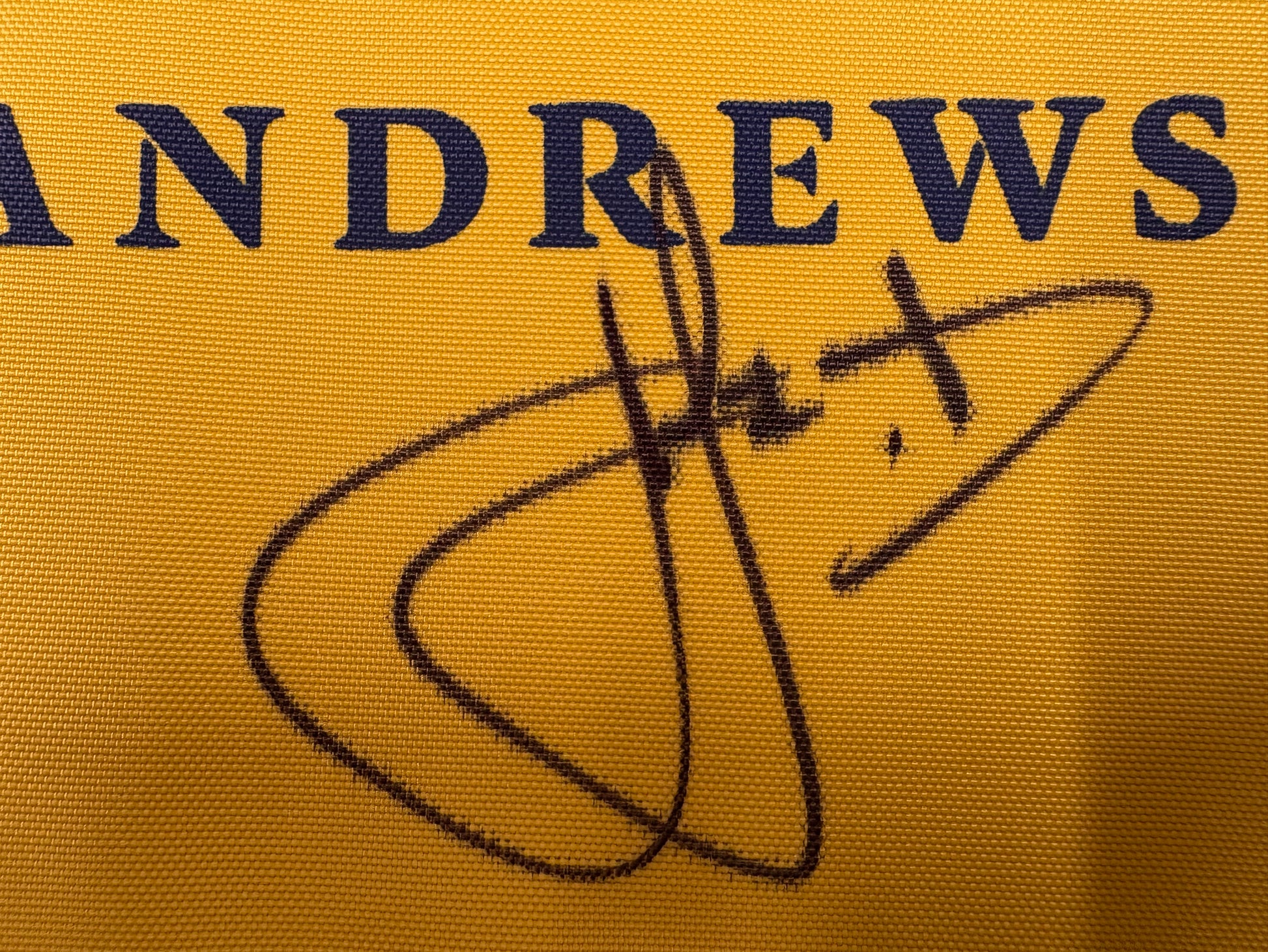 This 150th Open at St Andrews golf flag has been signed by Winner of the 2022 Open Cameron Smith and includes a dealer COA. A must-have for any golf fan, this item showcases a piece of history and adds value to any collection. Own a unique piece of the game with this Cameron Smith signed flag.