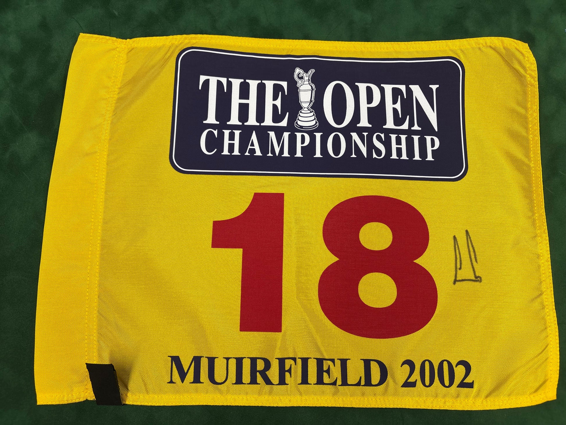 This authentic Ernie Els signed flag from the 2002 Open at Muirfield is a must-have for any golf fan. With a dealer COA included, this yellow flag is a valuable piece of golf history. Don't miss your chance to own a piece of the legend's legacy.
