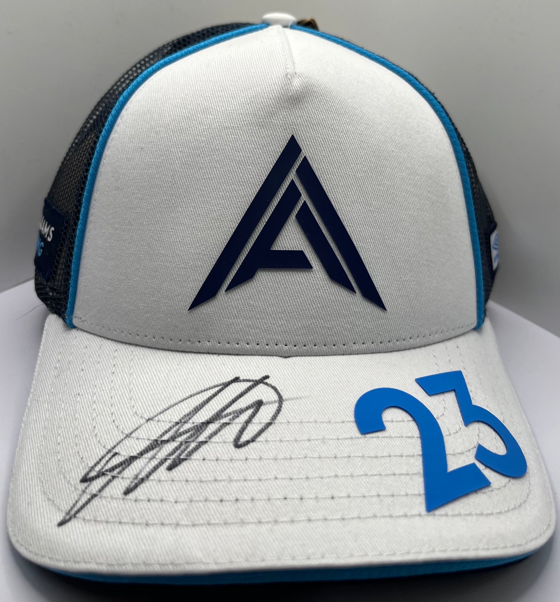 Get your hands on a piece of Formula One history with this signed white and blue F1 cap from Williams Racing Driver Alex Albon. Made with high-quality materials, this cap showcases Alex Albon's signature and comes with a Certificate of Authenticity for added assurance. Show your support for your favourite driver with this collectible item.