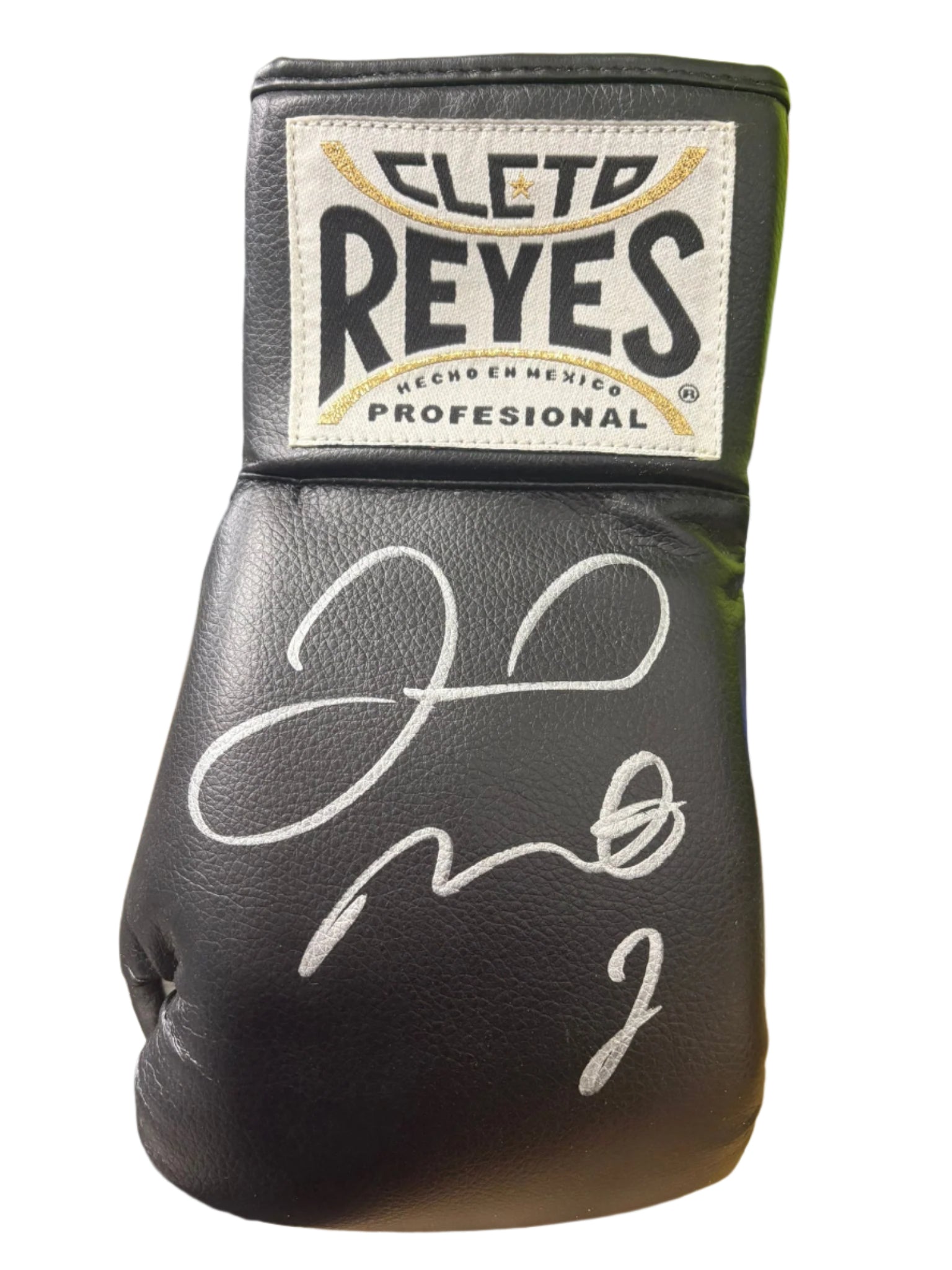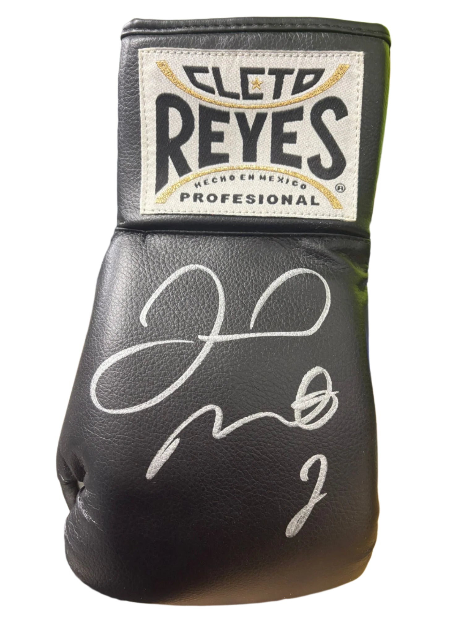 This Floyd Mayweather Jr signed black Cleto Reyes boxing glove comes with a dealer COA. Perfect for any boxing fan or collector, this glove showcases the skill and expertise of the undefeated champion.