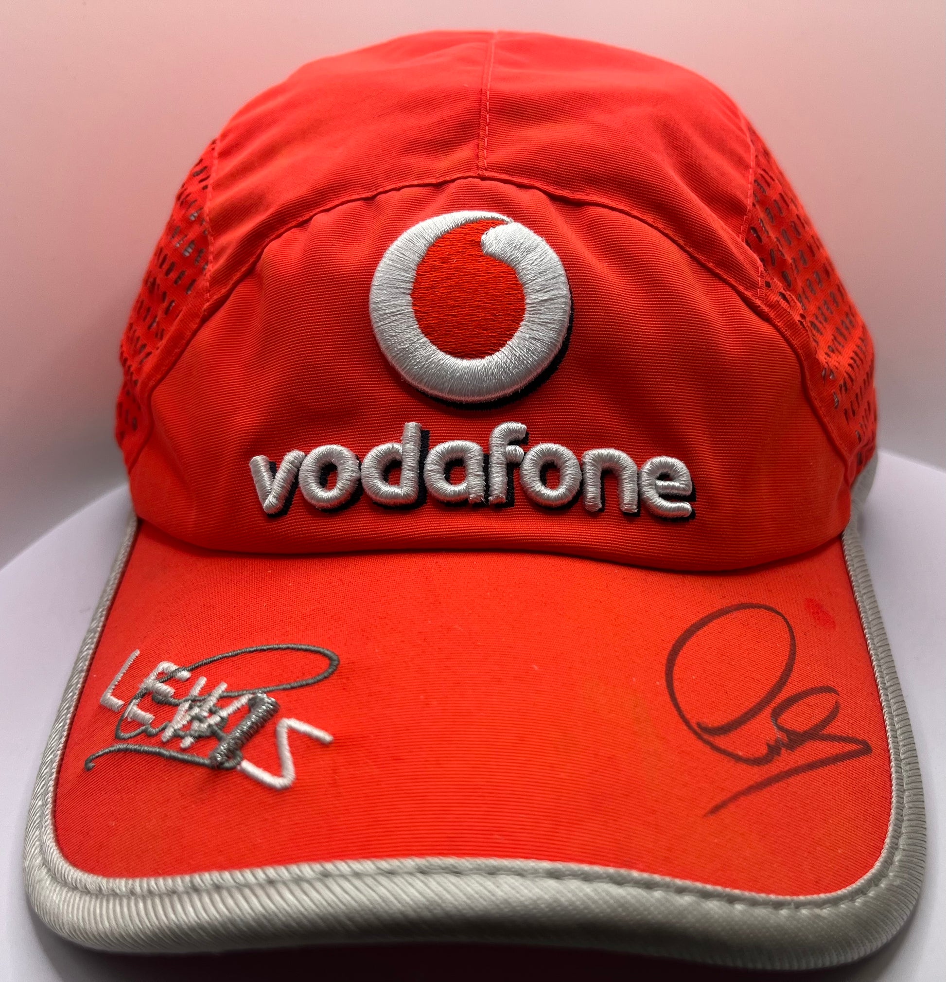 This Formula One legend Lewis Hamilton signed Vodafone McLaren Mercedes F1 cap is a collector's item for fans of the sport and the iconic driver. The orange and silver cap bears the signature of the famous Lewis Hamilton and comes with a COA for authenticity. Show your support for the champion with this exclusive piece.