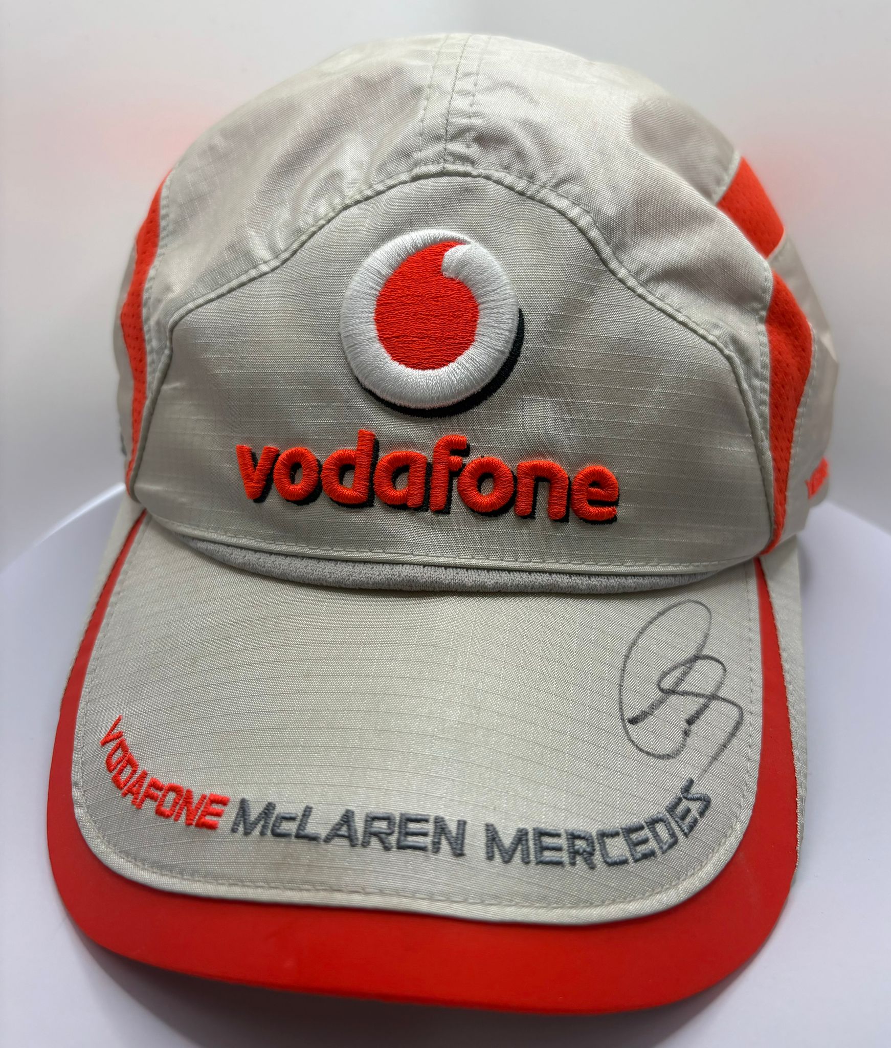 This Vodafone McLaren Mercedes F1 cap is signed by legendary Formula One driver Lewis Hamilton. Made of silver and orange material, this cap is a must-have for F1 fans. Comes with a Certificate of Authenticity. Own a piece of racing history with this exclusive item.