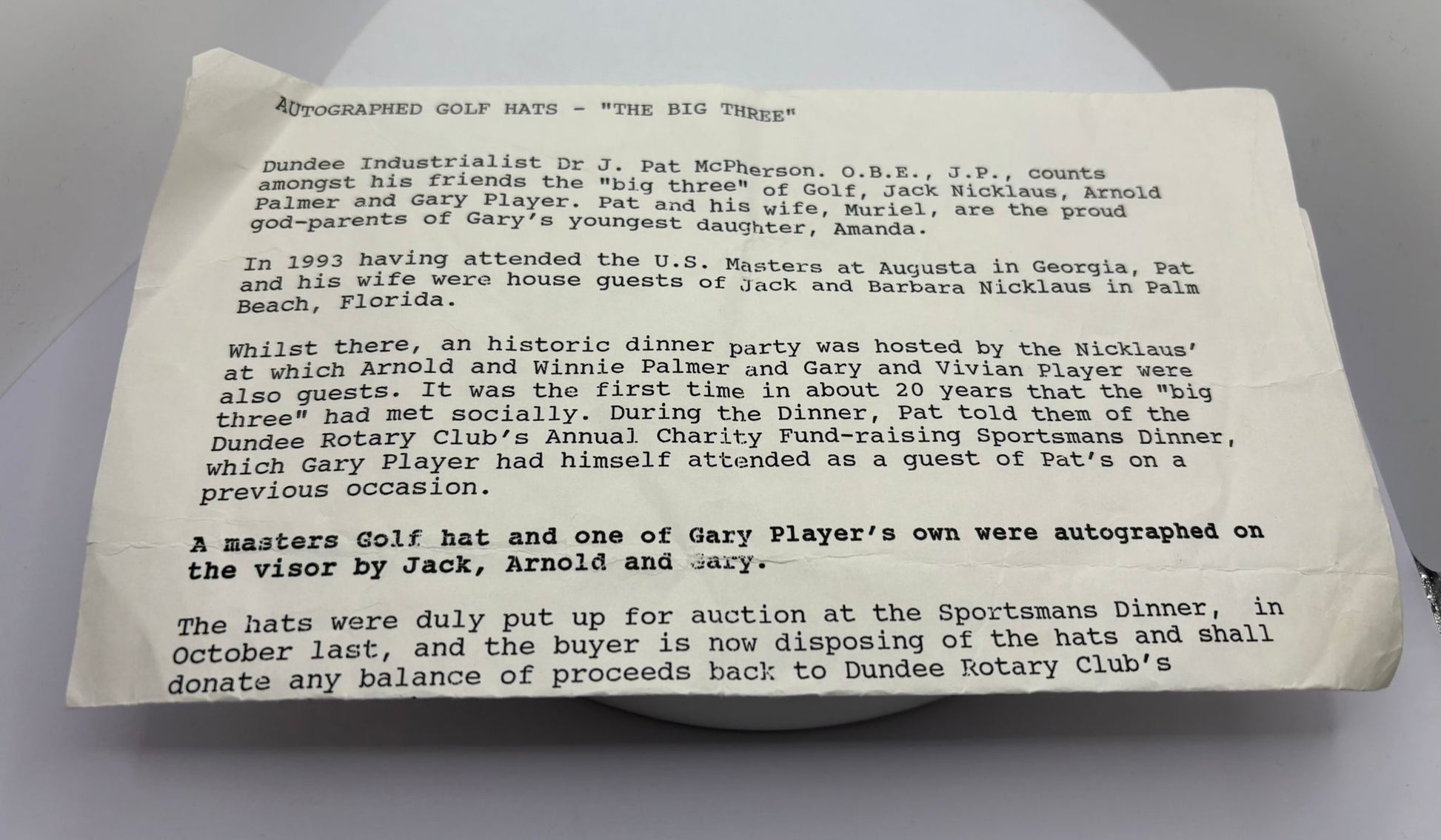 Golf Legends 'The Big Three' Gary Player, Arnold Palmer & Jack Nicklaus Signed Masters Golf Cap + Cert