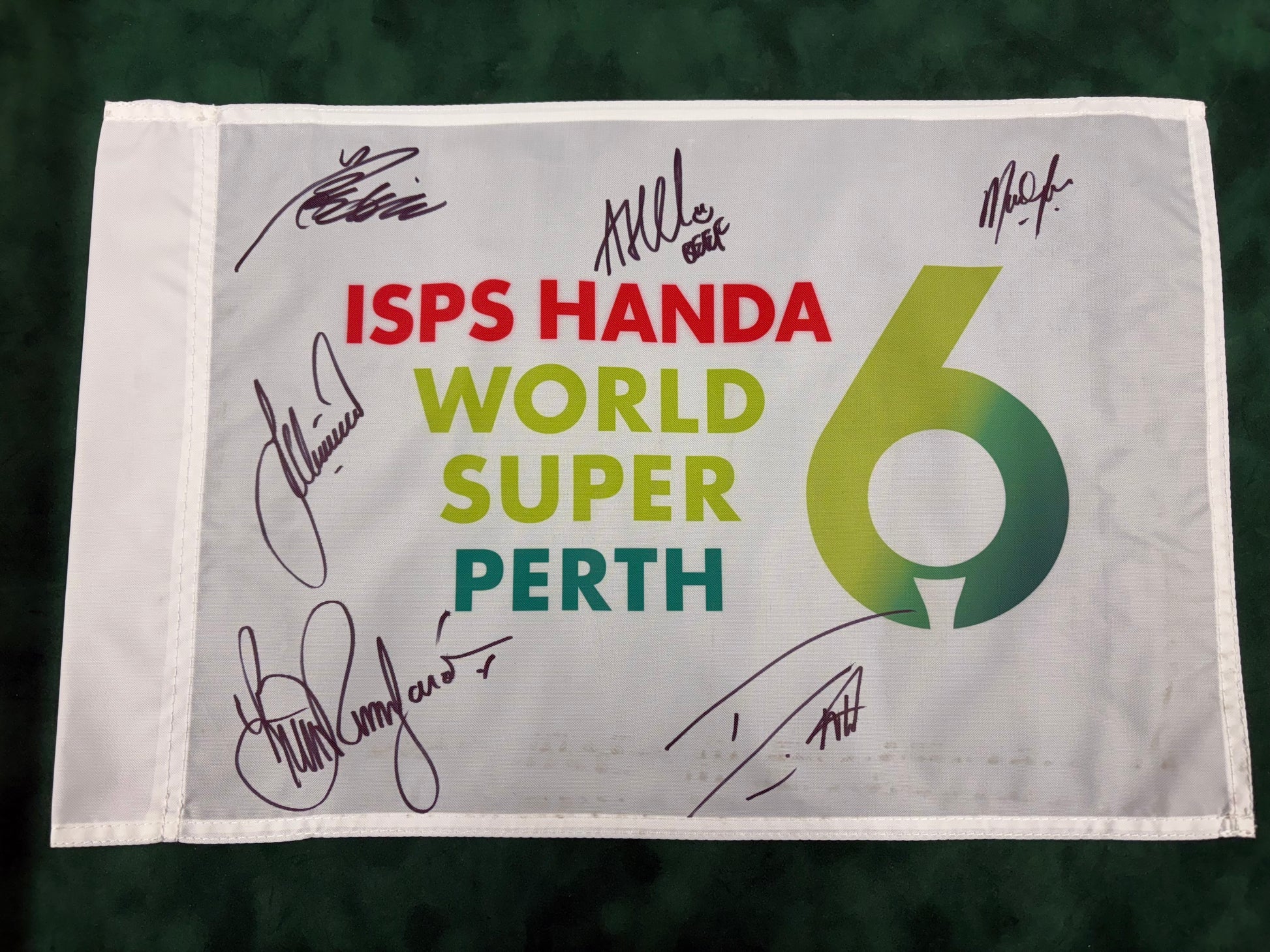 ISPS Handa World Super 6 Perth Signed Golf Flag - Rumford, Willett, Beef + Cert