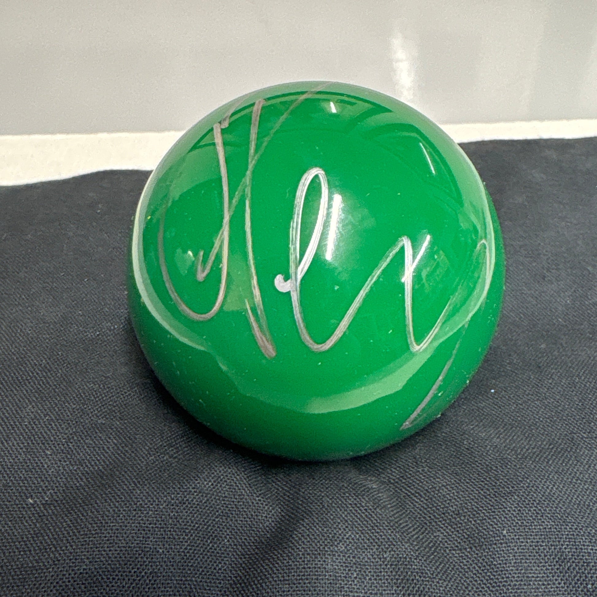 Have a ball with this one-of-a-kind Joe Perry Signed GREEN Snooker Ball! This unique piece boasts Joe Perry's signature and a vibrant green hue. What more could a snooker fan ask for? COA included.