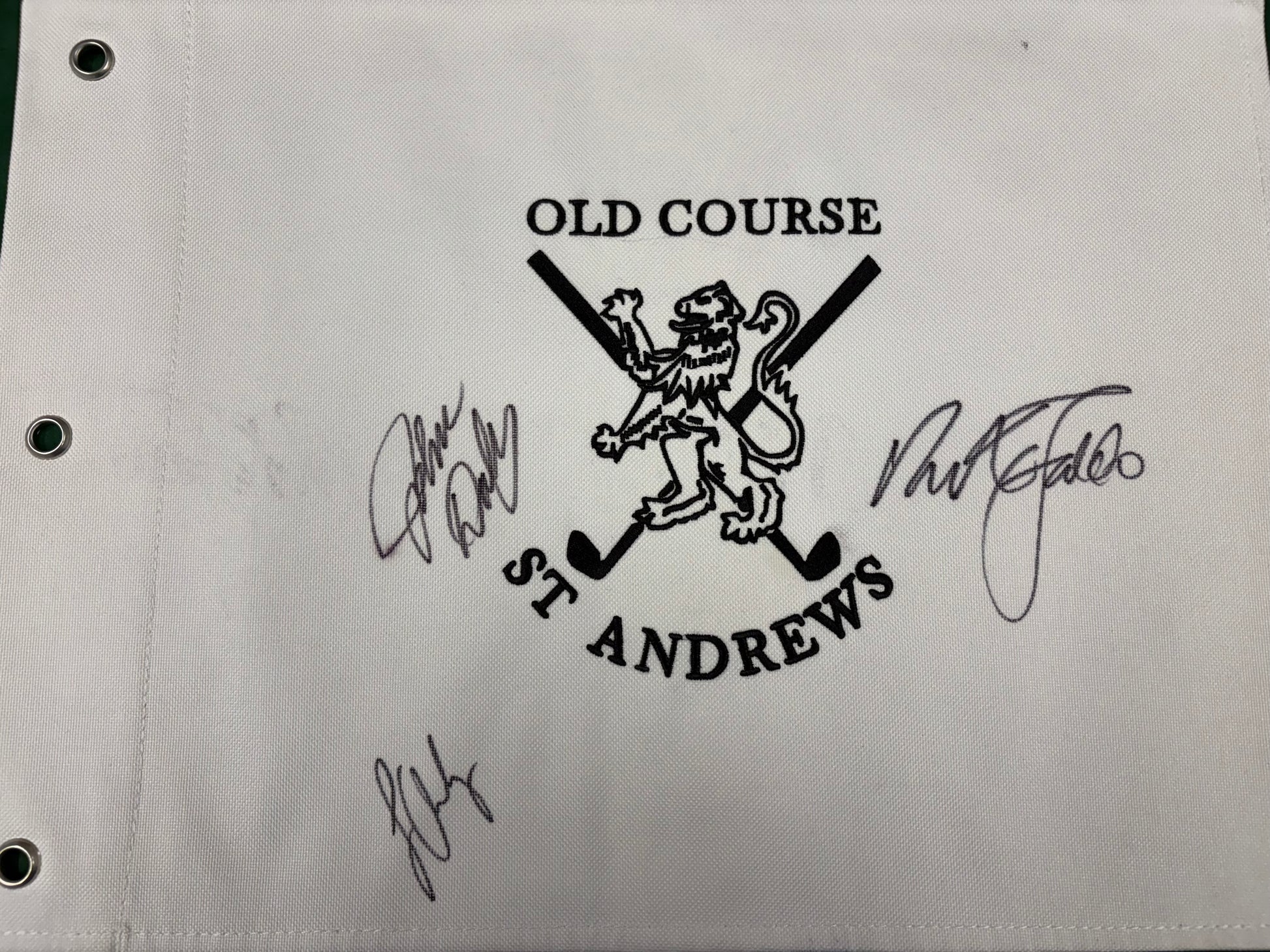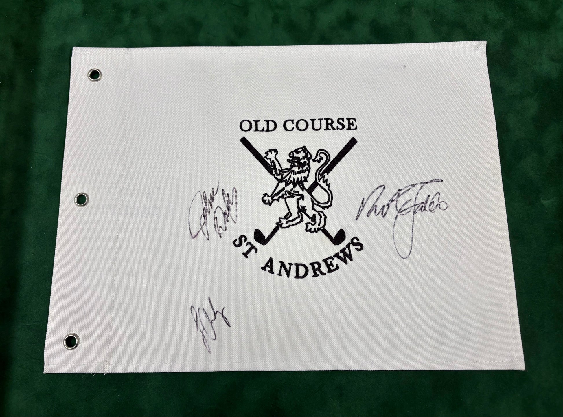 John Daly, Sir Nick Faldo & Louis Oosthuizen Signed St Andrews Old Course Golf Flag + Cert