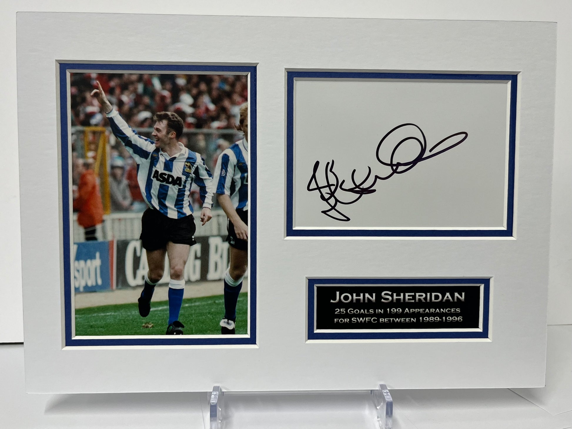 Capture the legendary football career of John Sheridan with this mounted A4 photo display featuring a certificate of authenticity. With 199 appearances for Sheffield Wednesday and 230 for Leeds, this display pays tribute to Sheridan's impressive professional record. Perfect for any soccer fan or sports enthusiast!