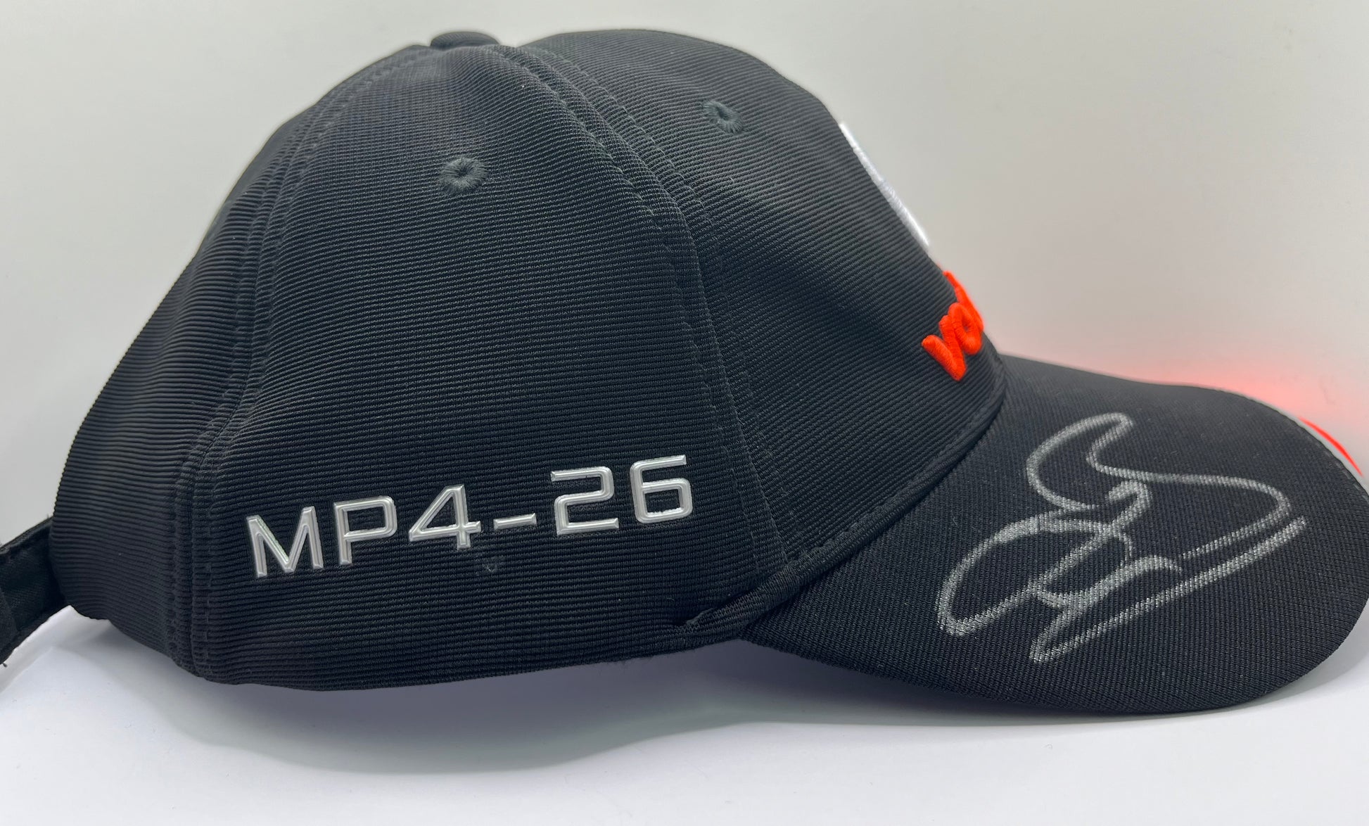 This black and red F1 cap features the signatures of Lewis Hamilton and Jenson Button, two world-renowned Formula 1 drivers. The cap is signed and authenticated with a COA, making it a valuable addition to any collection. Show your support for these champions with this unique piece.