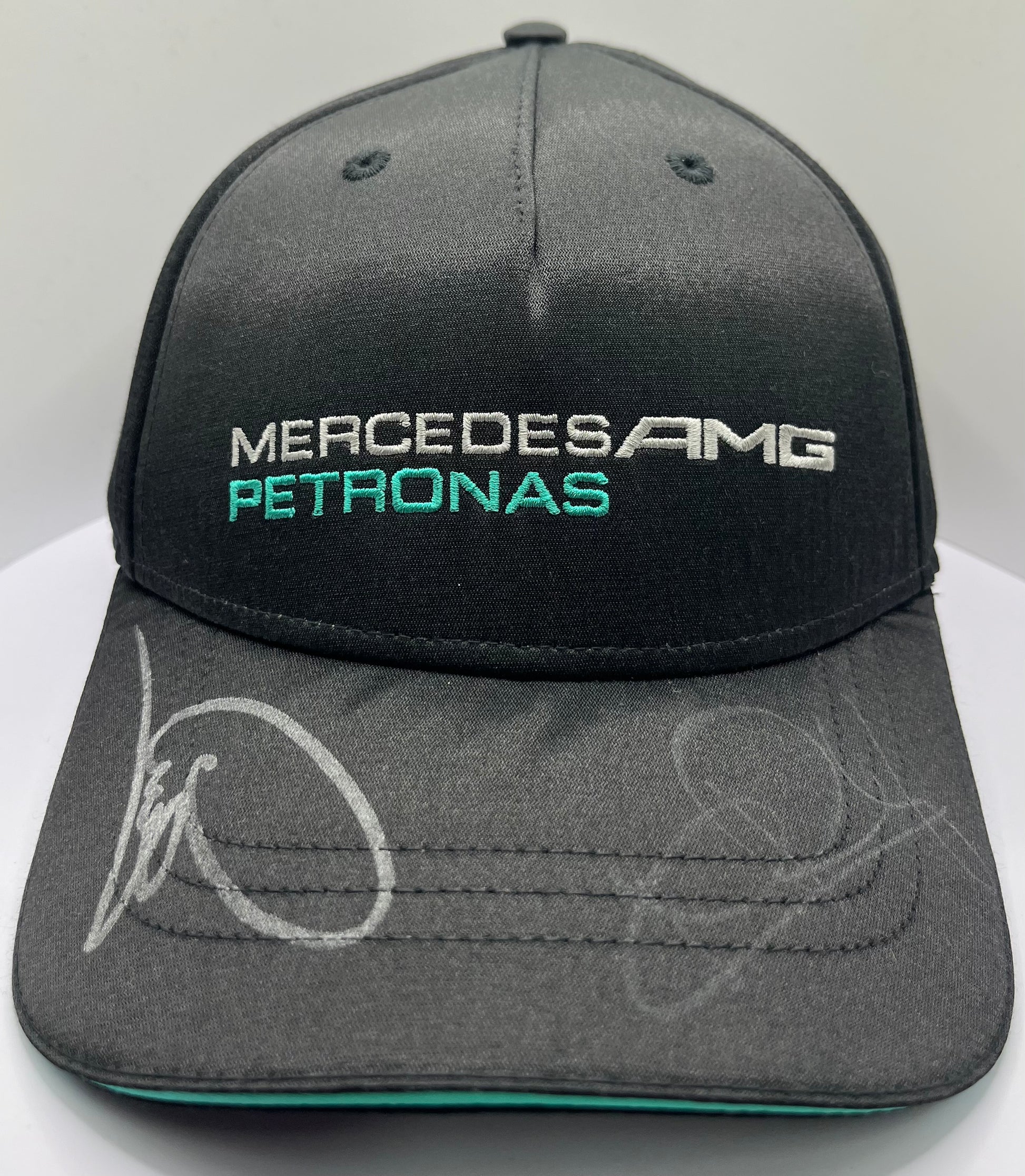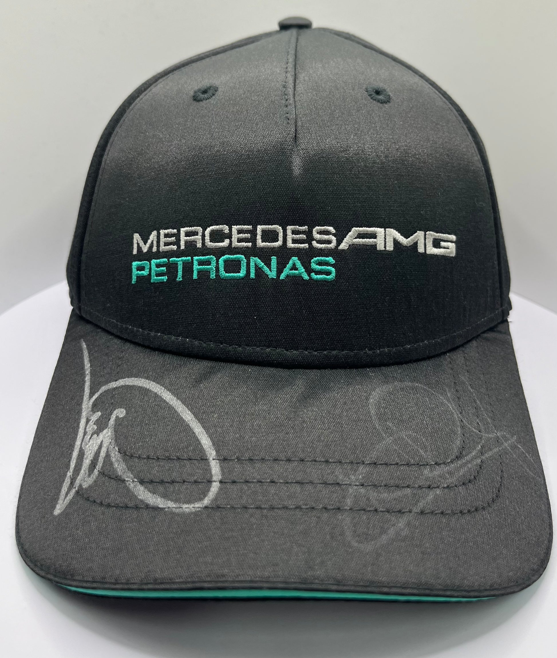 This signed Mercedes AMG Petronas F1 cap, featuring signatures from Lewis Hamilton and Nico Rosberg, is a must-have for motorsports fans. This official team merchandise adds value to any collection and comes with a certificate of authenticity. Show your support for two of the biggest names in F1 with this one-of-a-kind item.