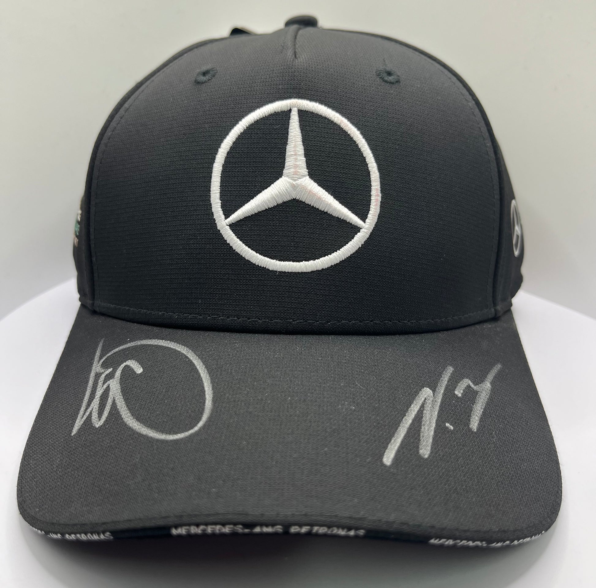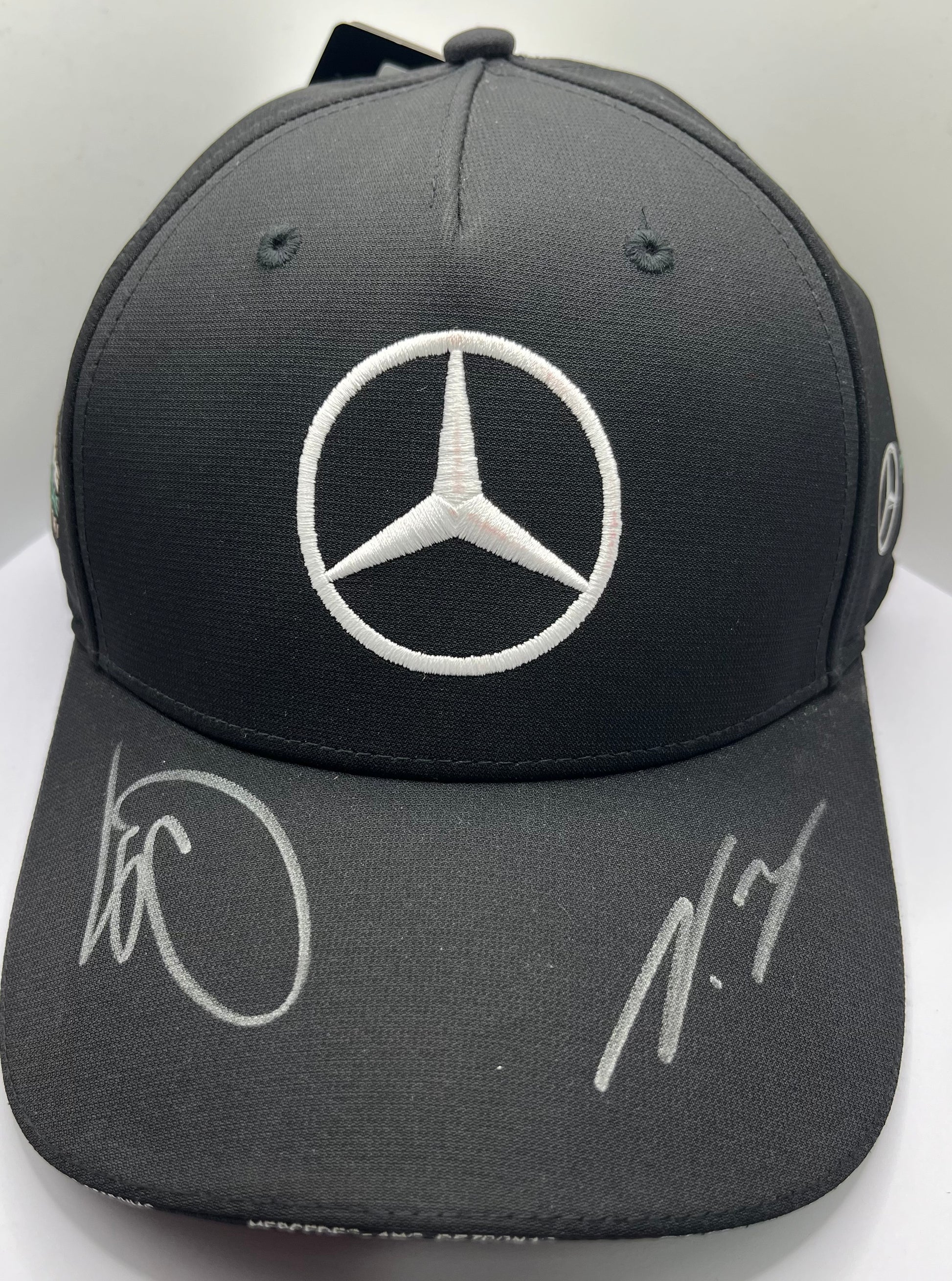 This Mercedes AMG Petronas black F1 cap, signed by world-renowned racers Lewis Hamilton and Valtteri Bottas, is a must-have for any F1 fan. Show off your love for the sport with this authentic piece, complete with a certificate of authenticity.
