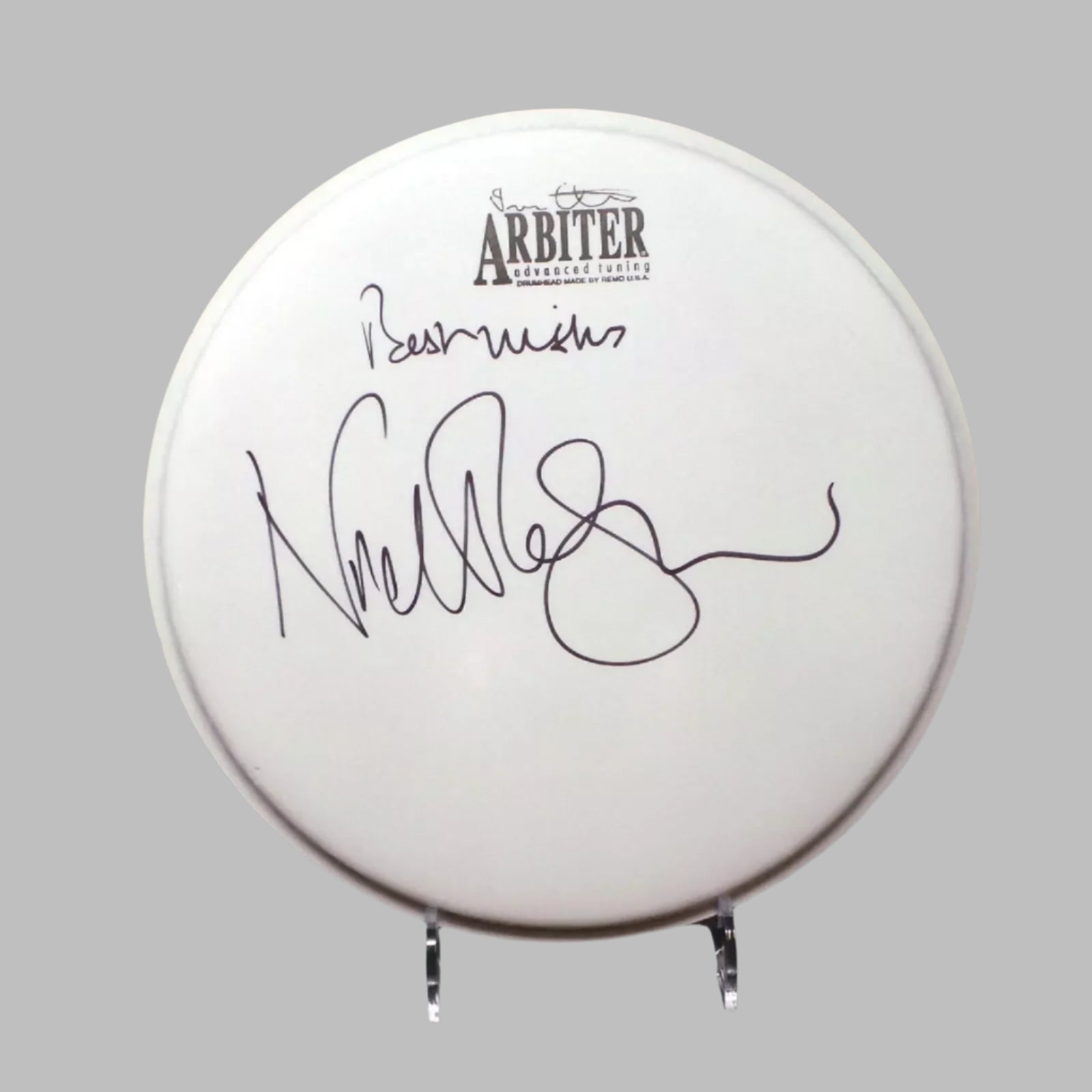 This 10" drum skin has been personally signed by Pink Floyd drummer Nick Mason. A must-have for any fan or collector, this autographed product comes with a dealer COA for added authenticity. Show off your love for music and add this unique piece of memorabilia to your collection.