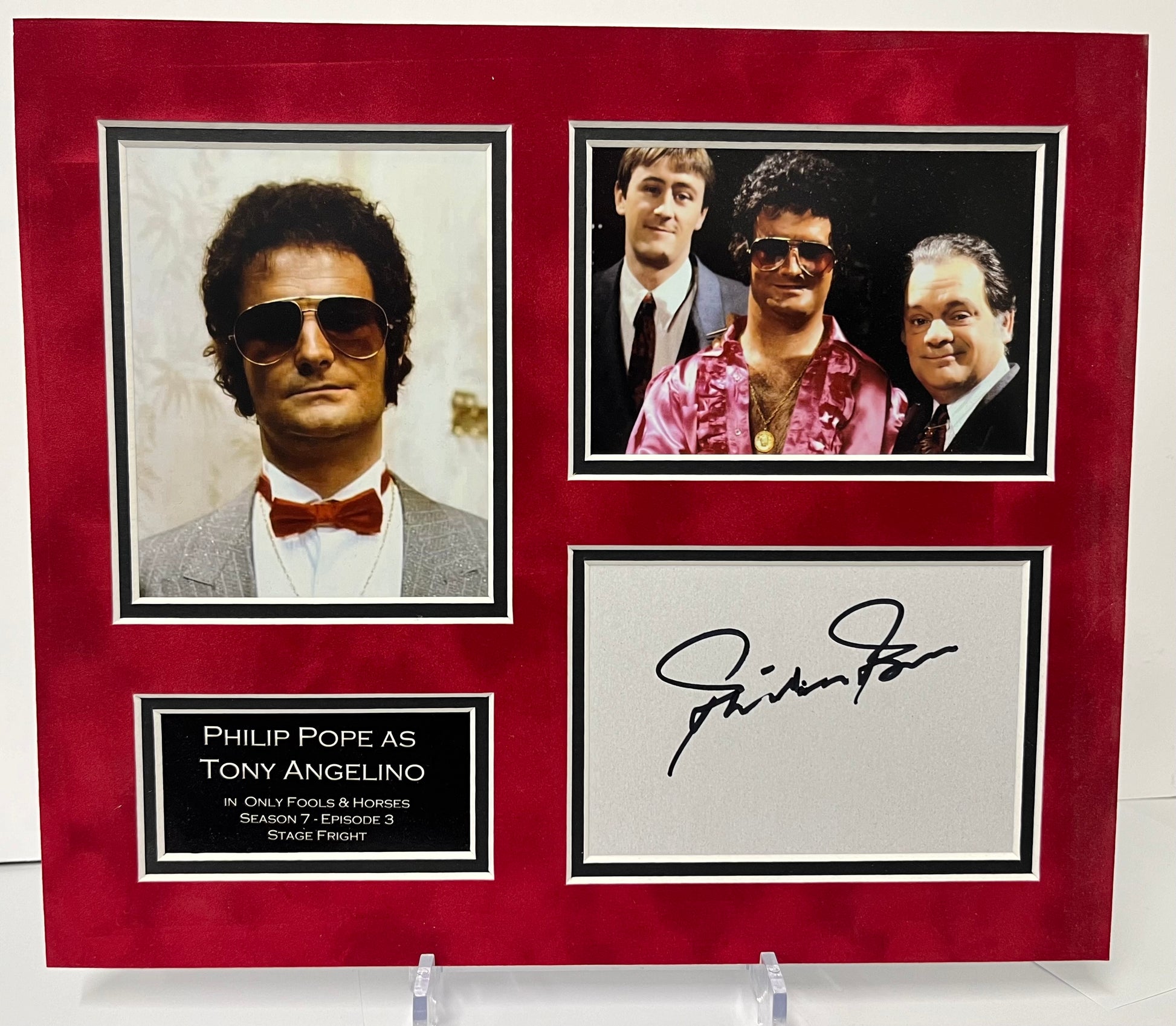 On offer here is a mounted display signed by Philip Pope who played Tony Angelino in the Sitcom Only Fools and Horses (Season 7, Episode 3). The display comes with a COA.