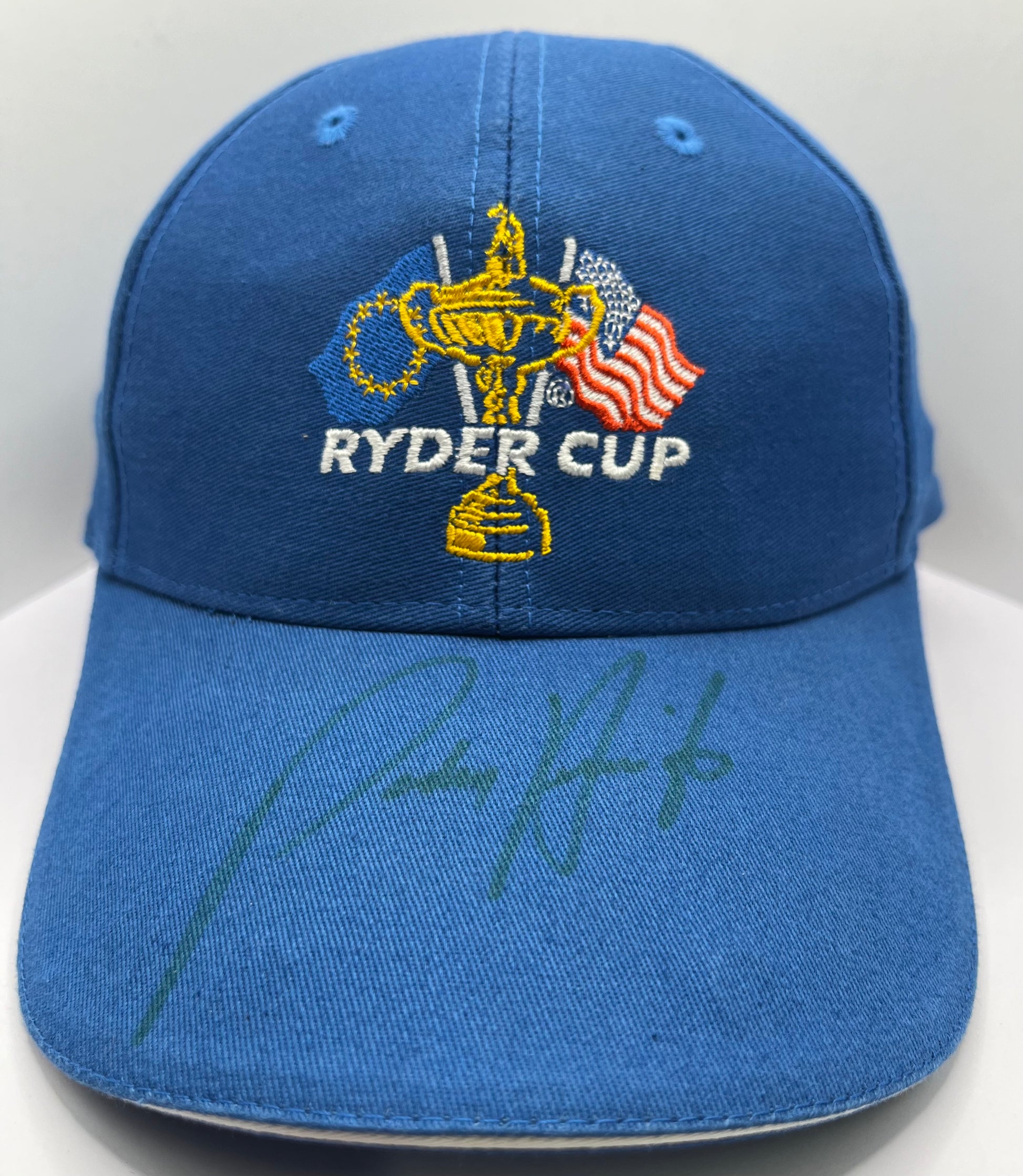 This blue Ryder Cup golf cap, signed by Padraig Harrington and accompanied by a Certificate of Authenticity, is the ultimate collector's item for any golf enthusiast. Representing team Europe, this cap signifies the skill, dedication, and passion of the legendary golfer. Don't miss your chance to own a piece of golf history.