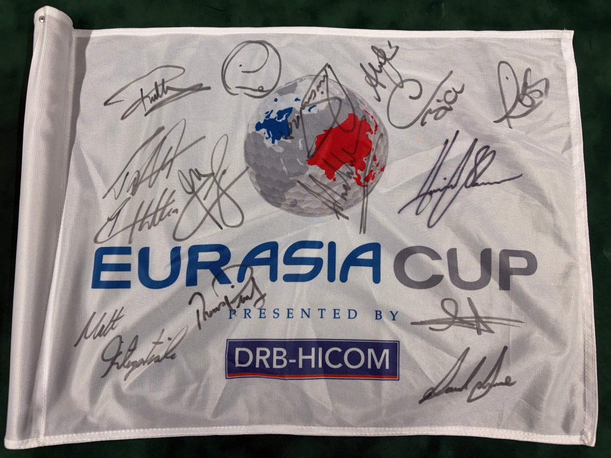On offer here is a Eurasia Cup Golf Pin Flag signed by Team Europe: