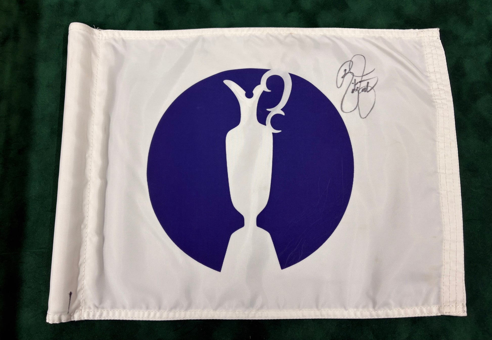 This rare Open Golf Flag is personally signed by golf pro Rickie Fowler and was used during a practice round at the Open. It is accompanied by a COA. A must-have for any golf enthusiast, this flag serves as a unique piece of memorabilia that showcases Fowler's skill and dedication. Own a piece of golf history with this one-of-a-kind item.