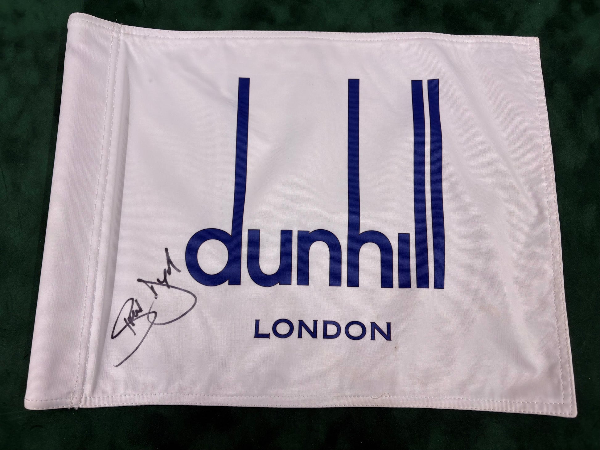 This signed course-used Dunhill Links Golf Pin Flag is signed by 2009 winner Simon Dyson. A must-have for avid golf fans, this flag serves as a unique collector's item and testament to Dyson's exceptional skills on the course. Each flag comes with a certificate of authenticity, ensuring its true connection to the legendary golfer.