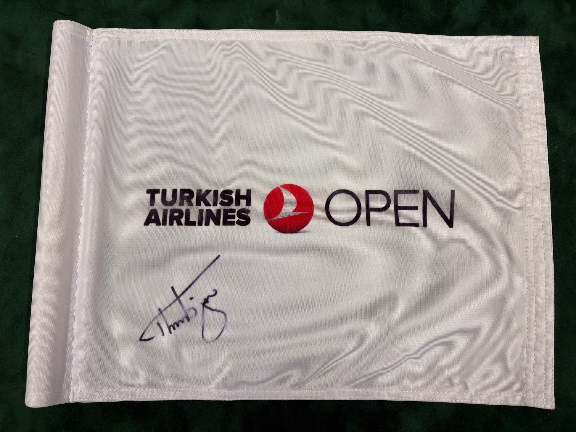 This authentic golf flag commemorates Thorbjørn Olesen's victory at the 2016 Turkish Open. It features Olesen's signature and was used on the course during the tournament. A must-have for any golf enthusiast, this collectible item is a piece of golf history, comes with a COA.