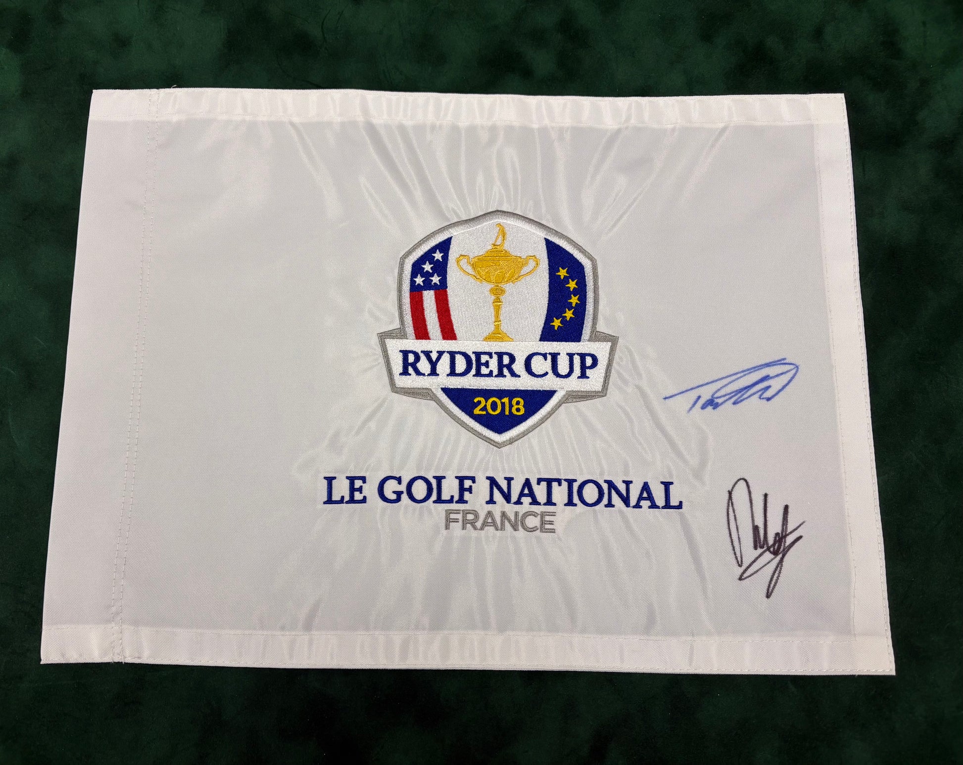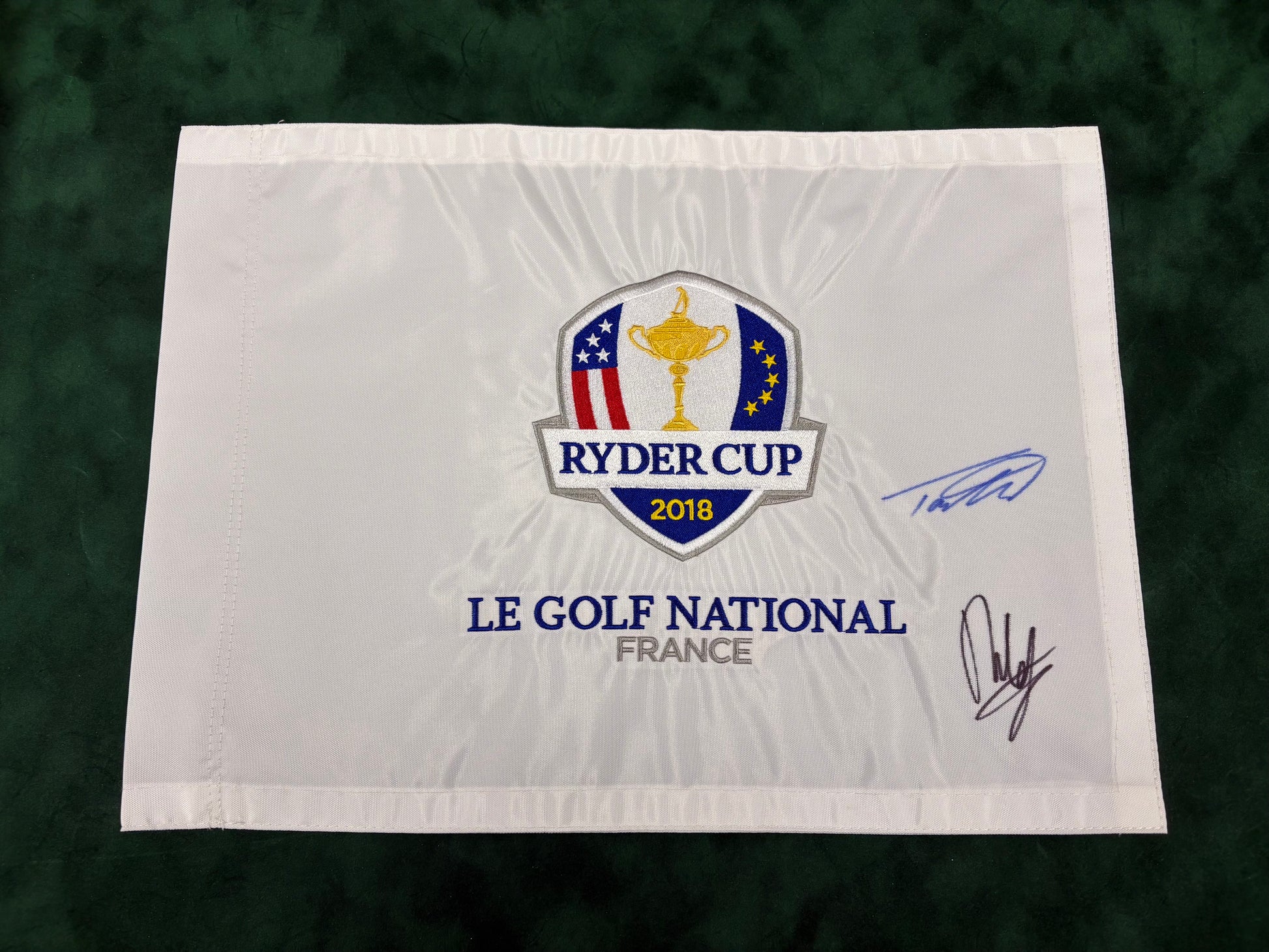 On offer here is a Ryder Cup Golf Pin Flag signed by both