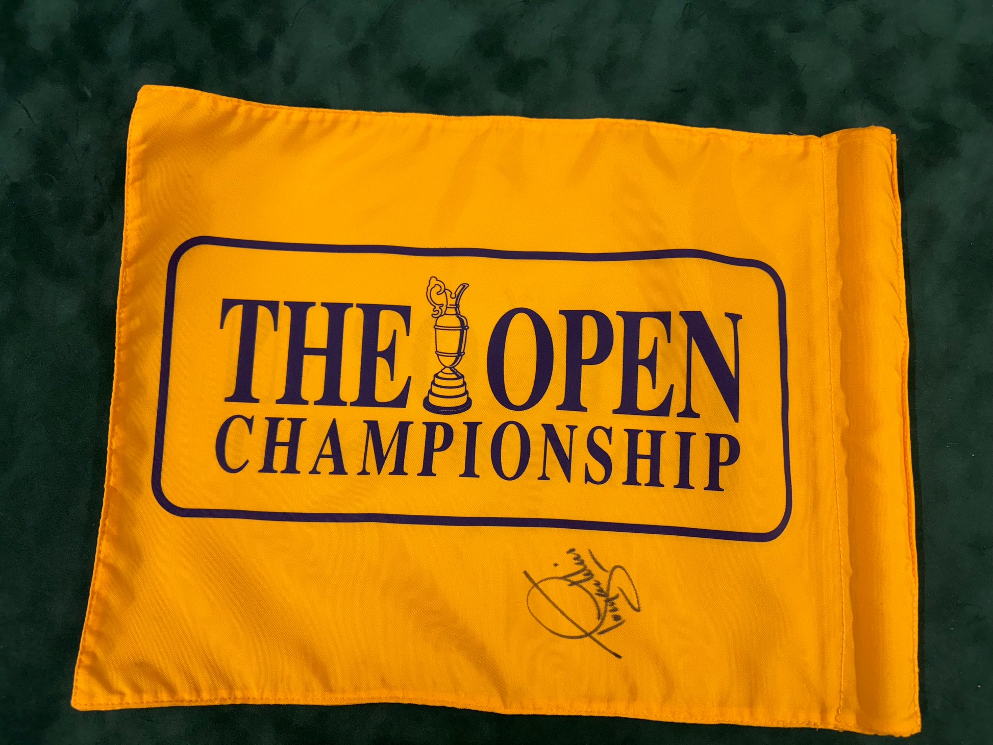 Experience the excitement of the Open Golf tournament with this Tony Jacklin signed pin flag. This rare collectible is a true piece of history, used on the actual course and accompanied by a dealer COA for authenticity. Own a piece of the action and add a touch of prestige to your collection.