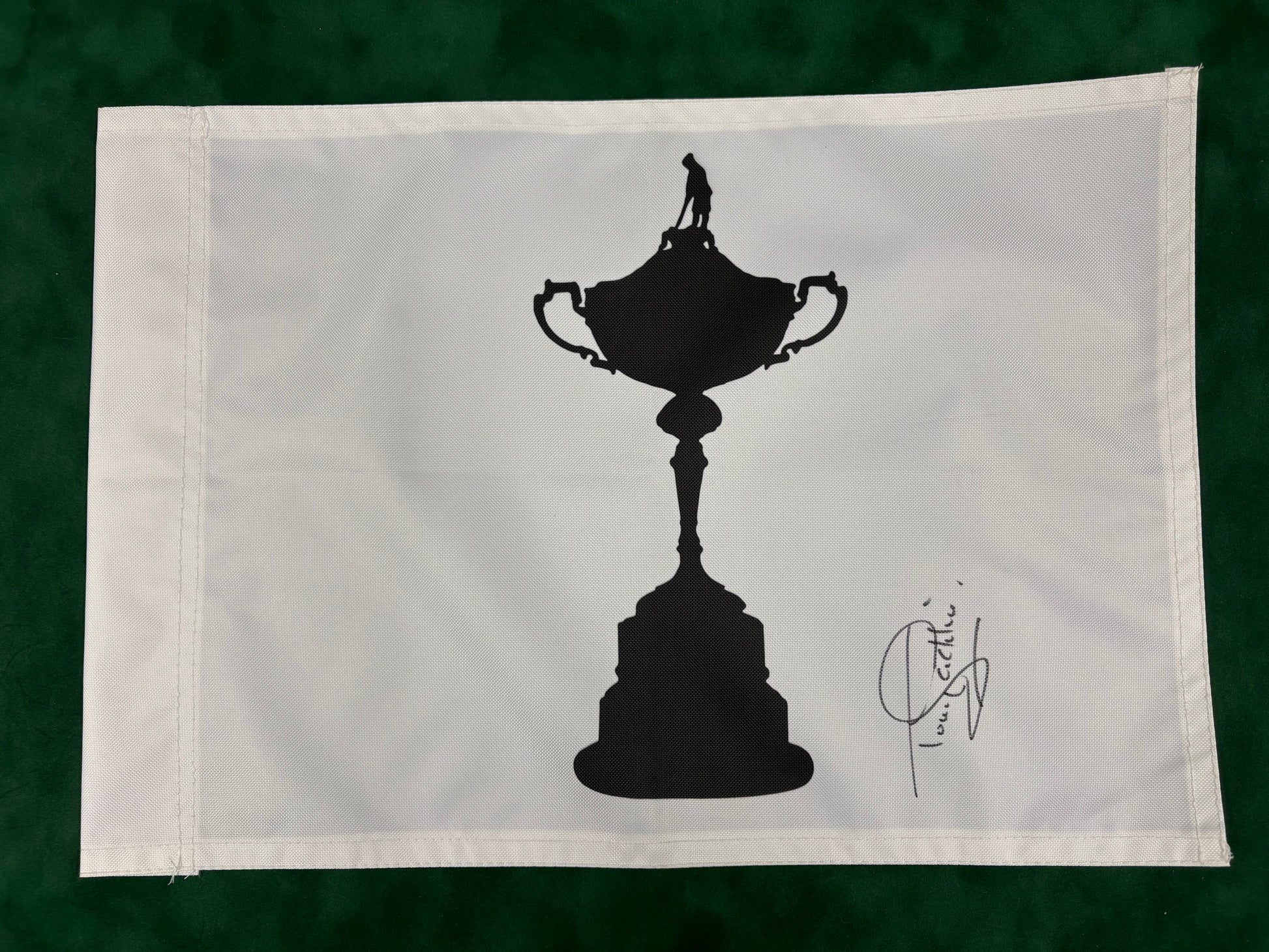 This authentic Ryder Cup golf pin flag, signed by legendary Ryder Cup winning Captain Tony Jacklin, comes with a dealer COA for guaranteed authenticity. Perfect for any golf enthusiast or collector, with the added value of a signed flag from one of the sport's greatest figures.