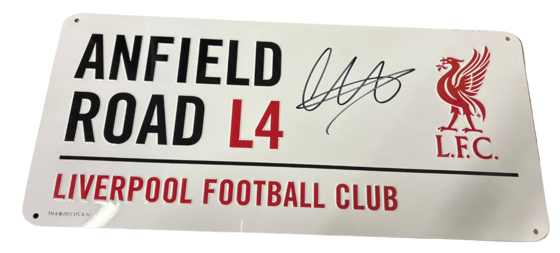 Explore the world of Liverpool FC with this authentic white Anfield Road football street sign, signed by Trent Alexander-Arnold himself. Display it proudly in your home or office and show your support for the team. Certificate of authenticity included.
