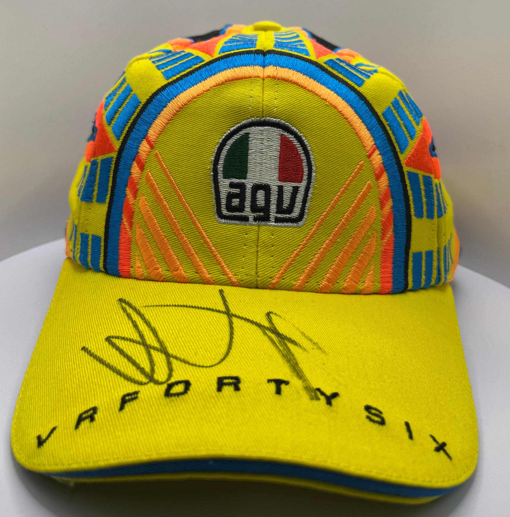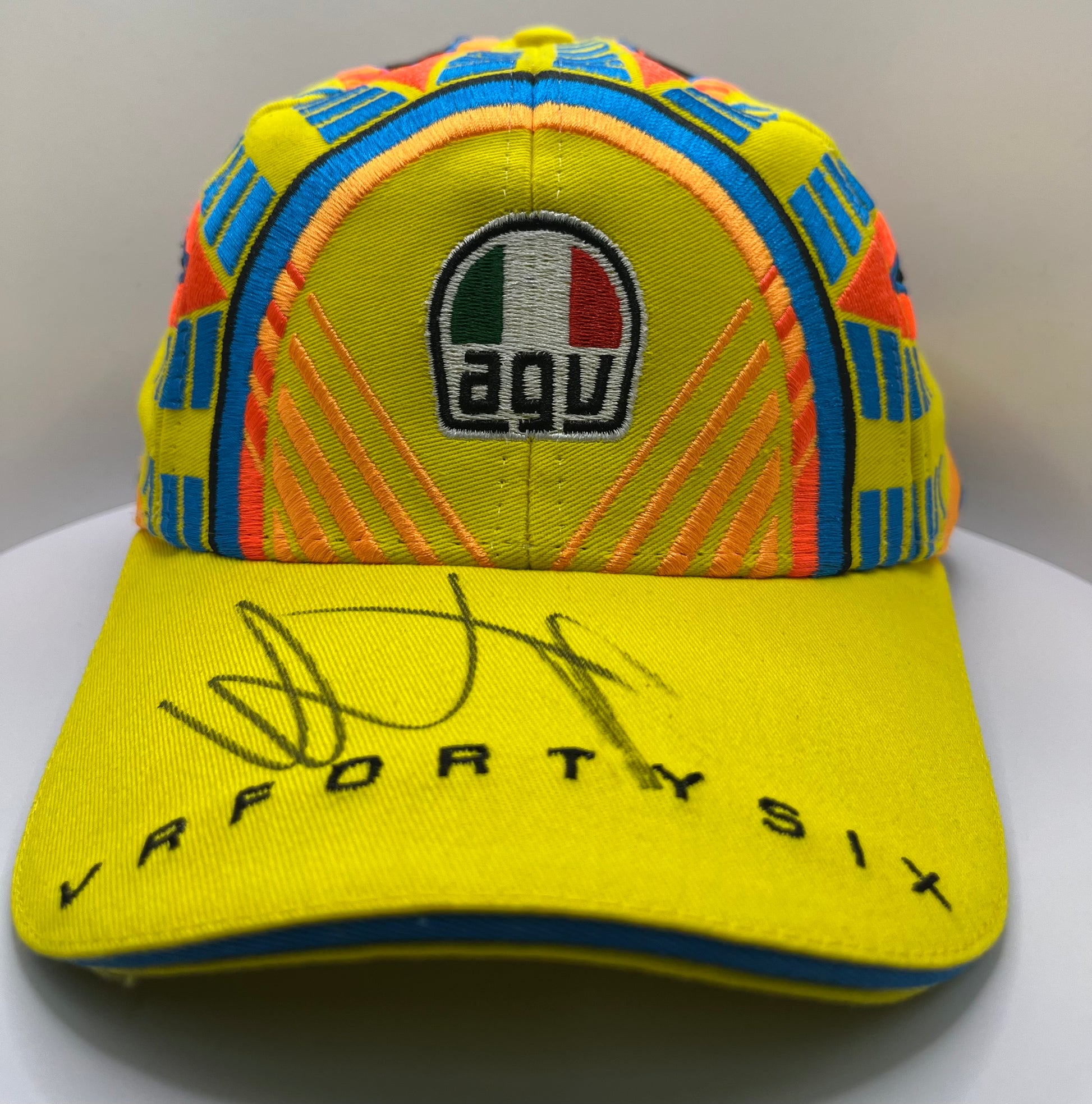 Unleash your inner MotoGP fan with the Valentino Rossi Signed AGV VR FortySix Colourful MotoGP Cap! This limited edition cap is hand-signed by the legend himself and comes with a certificate of authenticity. Show your support for Rossi on and off the track with this exclusive piece.