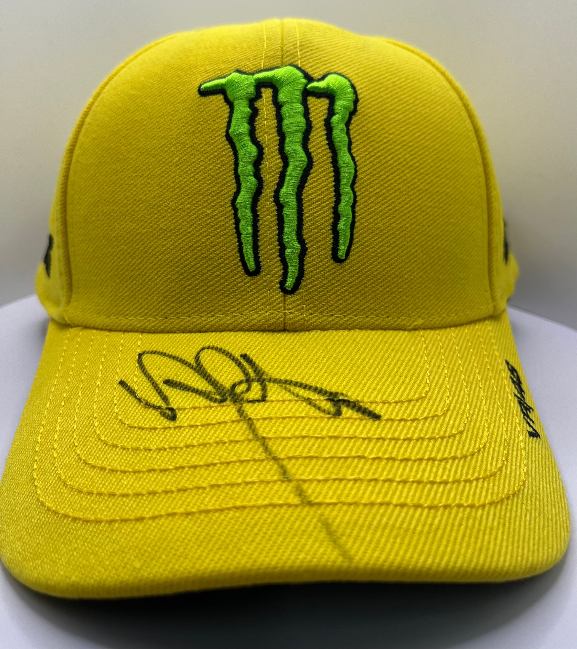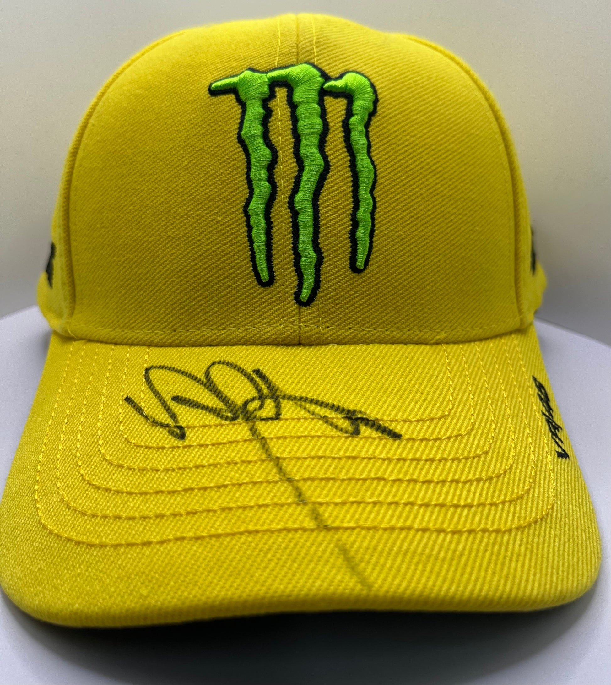 This Valentino Rossi Signed Yellow Monster Energy MotoGP Cap comes with a COA, making it a valuable addition to any fan's collection. Show your support for the legendary racer and elevate your fan gear with this authentic cap.