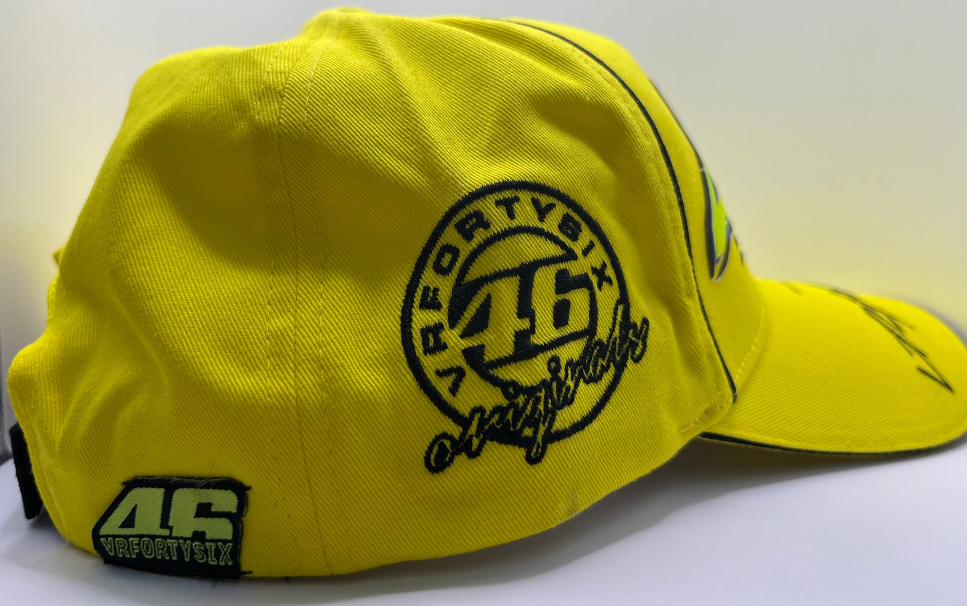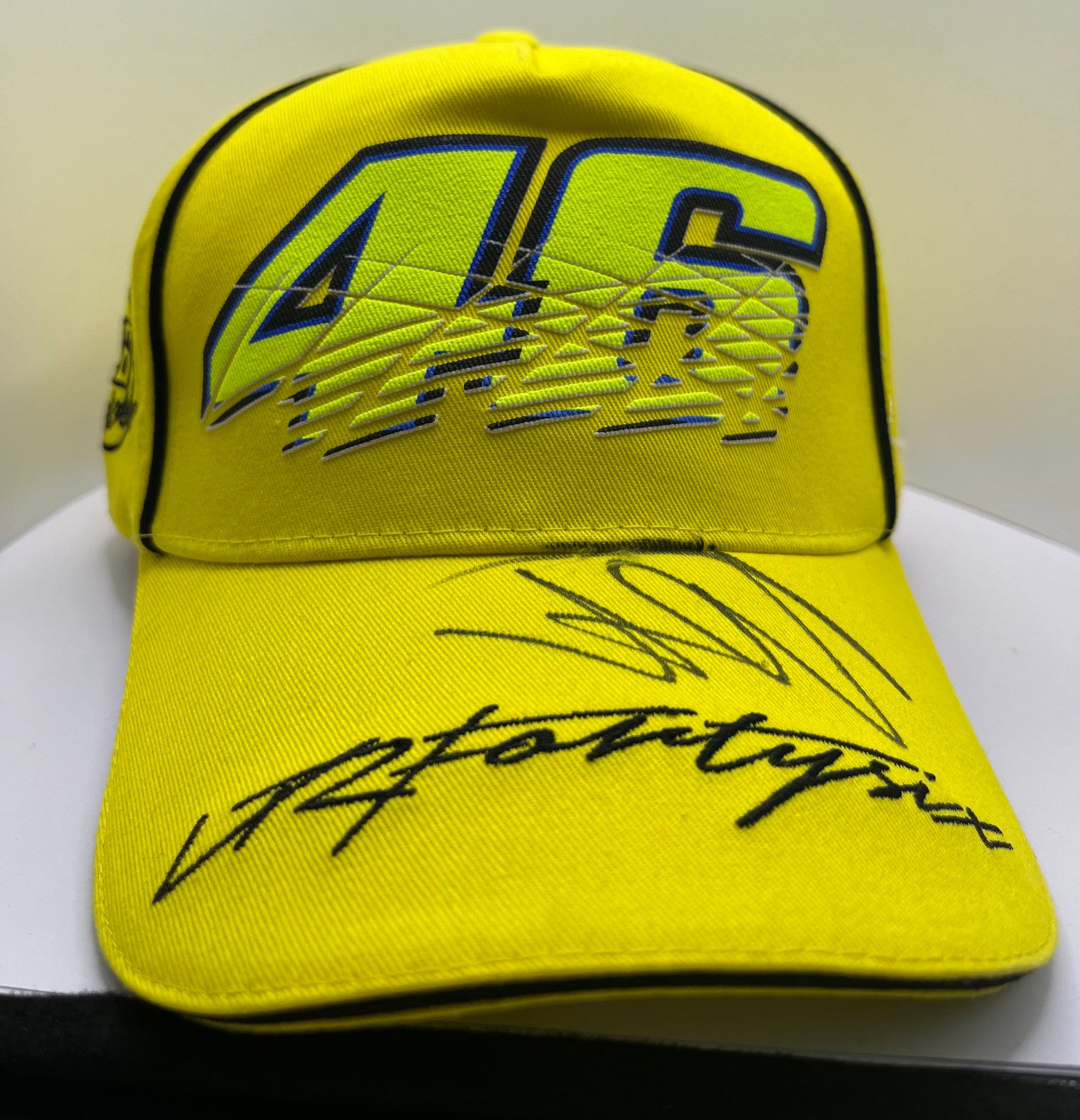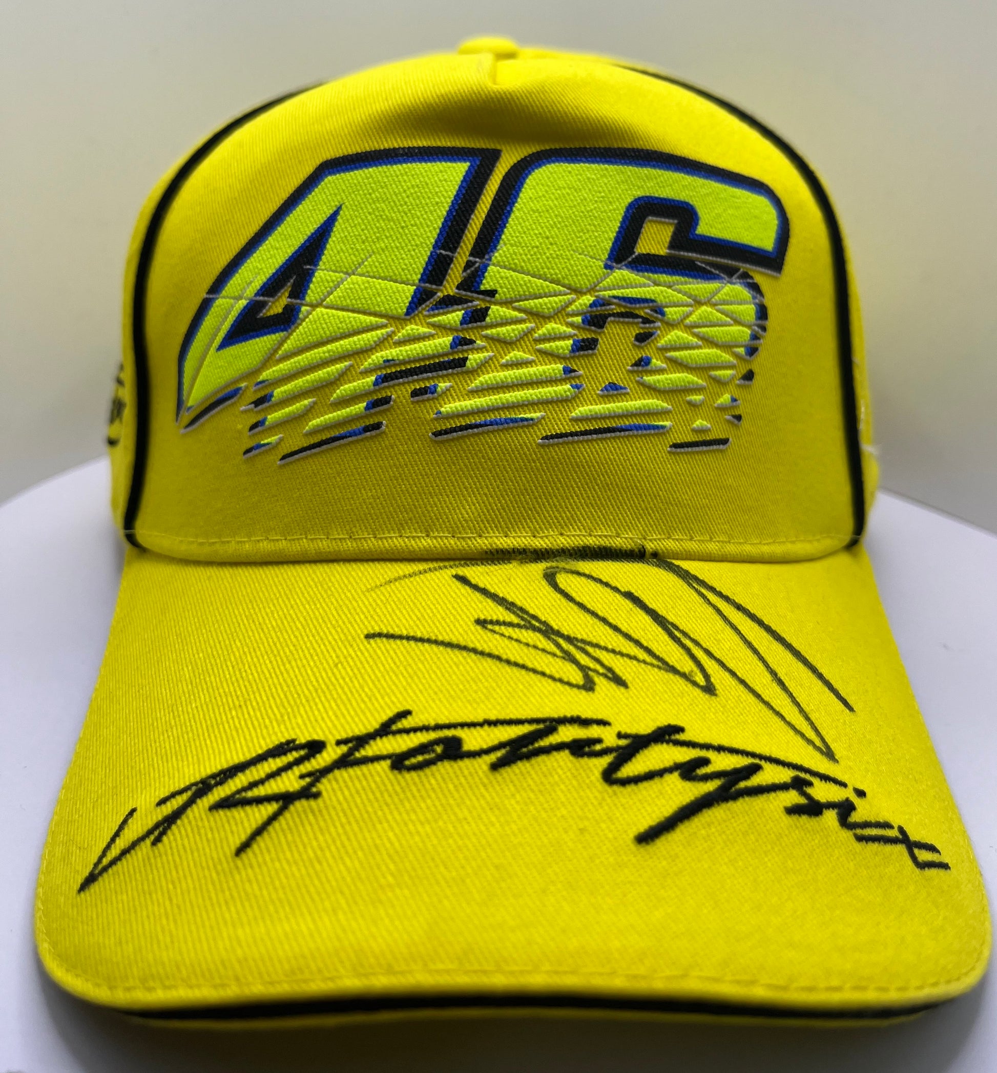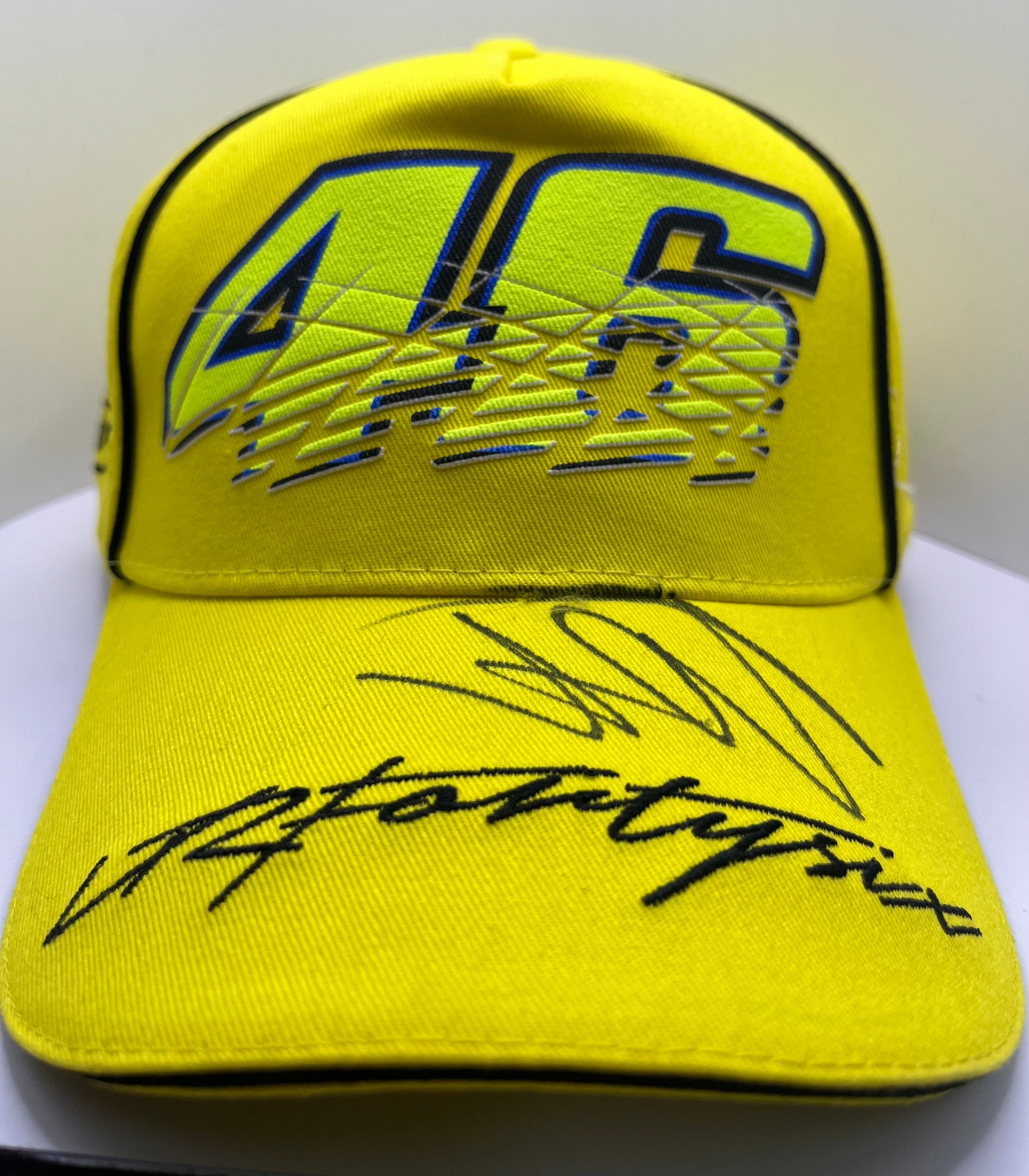 This official Valentino Rossi Signed Yellow VRFortySix MotoGP Cap comes with a Certificate of Authenticity. Showcasing the iconic number 46 of the legendary racer, this cap is a must-have for any fan or collector. Own a piece of MotoGP history with this signed cap from Valentino Rossi himself.